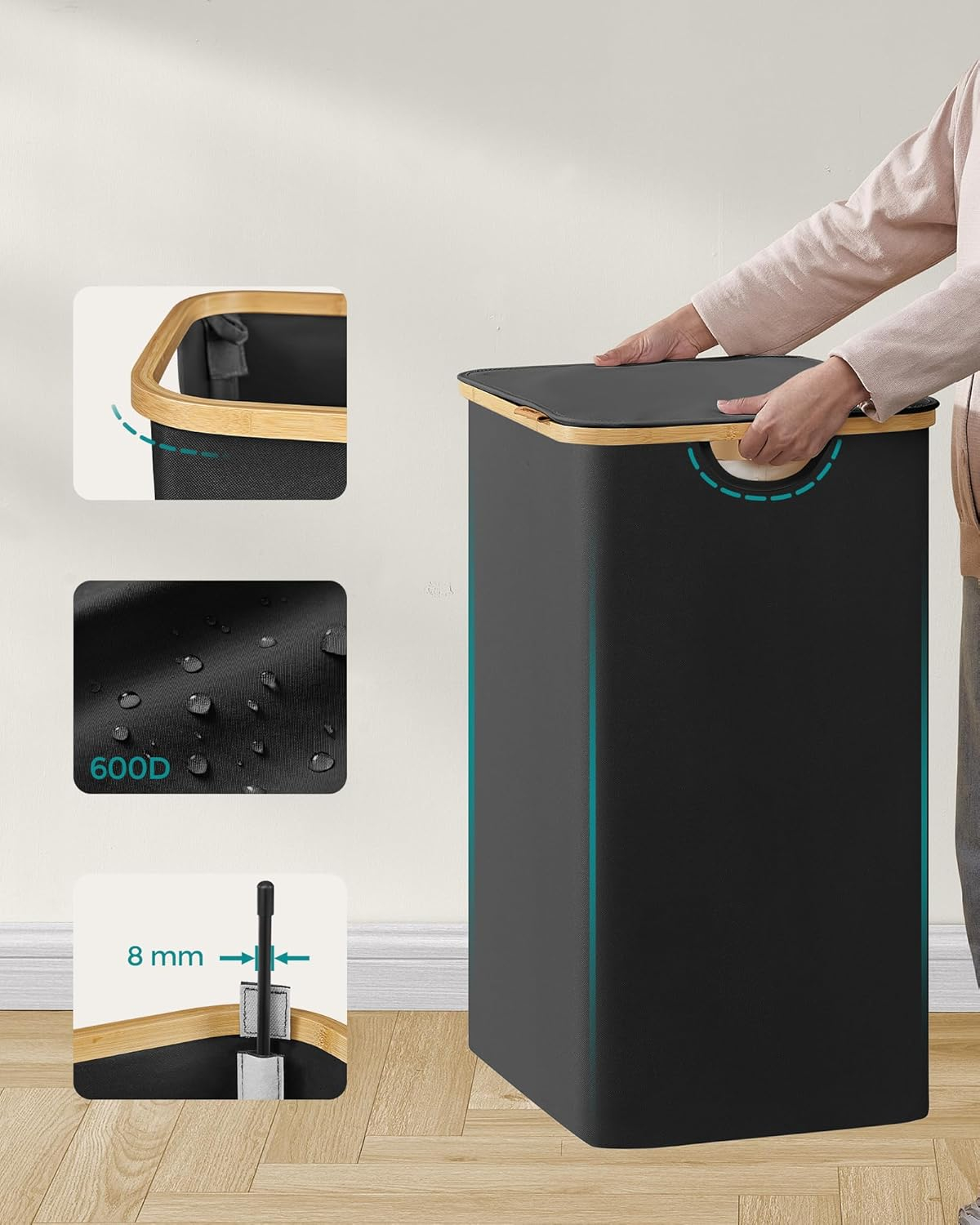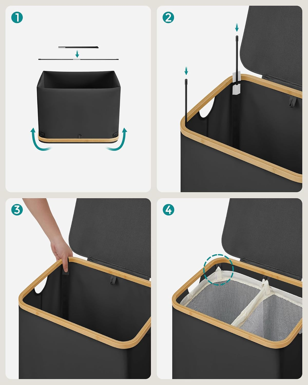 Detalii produs: - Culoare: negru- Material: bambus, 600D panza Oxford, tije din fibra de sticla- Dimensiuni: 52 x 38,5 x 70,5 cm (L x l x i)- Greutate: 2,1 kg.- Sarcina maxima: sarcina statica: 15 kg. Pachetul include: 1 x Cos de rufe1 x set de accesorii1 x manual de utilizare Note VASAGLE: Nu este recomandat sa depozitati cosul de rufe intr-un mediu umed pentru o perioada lunga de timp pentru a evita deteriorarea.Evitati sa plasati obiecte grele pe capac pentru a nu fi deteriorat.Nu depozitati obiecte ascutite in acest cos de rufe pentru a evita deteriorarea sau ranirea. 2 compartimente spatioase Acest cos de rufe de 130L cu dimensiuni de 52 x 38,5 x 70,5 cm si 2 compartimente este perfect pentru sortarea rufelor pentru o gospodarie de 3 persoane si simplificarea rutinei de spalare. Capac practic cu maner Capacul impiedica patrunderea prafului si va protejeaza intimitatea. Logo-ul din piele artificiala de pe capac serveste drept maner pentru o deschidere usoara si adauga o nota de eleganta Saci detasabili si versatili Sacii fixati de inchizatori Velcro sunt usor de indepartat. Corzile servesc drept manere pentru un transport usor. Datorita designului lor din plasa, acestea sunt, de asemenea, potrivite ca saci de rufe pentru spalatul sortat la masina Durabil si robust Cosul de rufe este fabricat din tesatura Oxford 600D ingrosata, hidrofuga, rezistenta la rupere si usor de curatat. Structura sa interna este sustinuta de tije din fibra de sticla pentru o mai mare stabilitate Asamblare usoara Instructiuni clare si nu sunt necesare unelte - puteti asambla acest cos de rufe in doar 5 minute