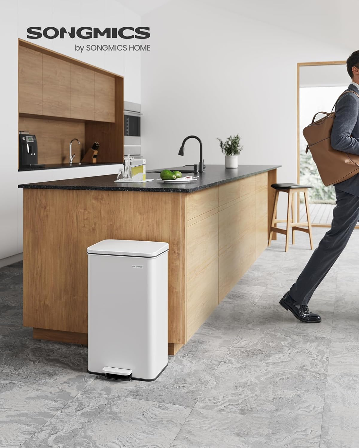 SONGMICS Cos de gunoi cu pedala, capacitate 40 litri, este potrivit pentru bucatarie datorita designului modern si mecanismului de inchidere lenta. Capacului i se poate mentine pozitia deschisa in timpul gatitului, iar sistemul de fixare a sacului pastreaza interiorul ordonat si discret.