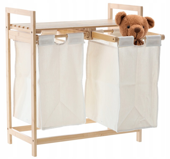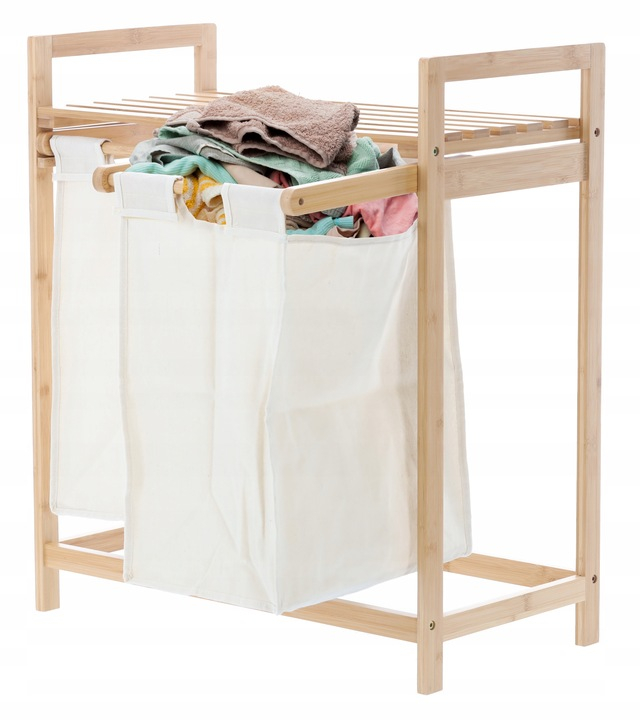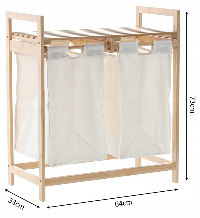 Dimensiuni:  Latime: 64 cm  Adancime: 33 cm  Inaltime: 73 cm Un raft din bambus cu cosuri din tesatura nu numai ca va ajuta sa pastrati lucrurile in ordine, dar adauga si farmec natural si organizare casei dvs., permitandu-va sa utilizati spatiul eficient si sa va organizati lucrurile de zi cu zi.  Material: Fabricat din bambus de inalta calitate , raftul este durabil, usor si ecologic. Cosurile sunt realizate din material textil rezistent.  Design cu doua cosuri: Raftul este echipat cu doua cosuri de material extras , ceea ce faciliteaza sortarea rufelor, jucariilor sau a altor articole.   Functionalitate: Perfect pentru depozitarea rufelor inainte de sortare sau ca organizator pentru jucariile copiilor. Cosurile de material pot fi indepartate si transportate cu usurinta. Instalare si intretinere: Raftul este foarte usor de asamblat si nu necesita unelte specializate. Usor de pastrat curat.  Versatilitate: Datorita multifunctionalitatii sale , poate fi folosit in diverse incaperi, cum ar fi o baie, dormitor, camera copiilor sau chiar un dressing.