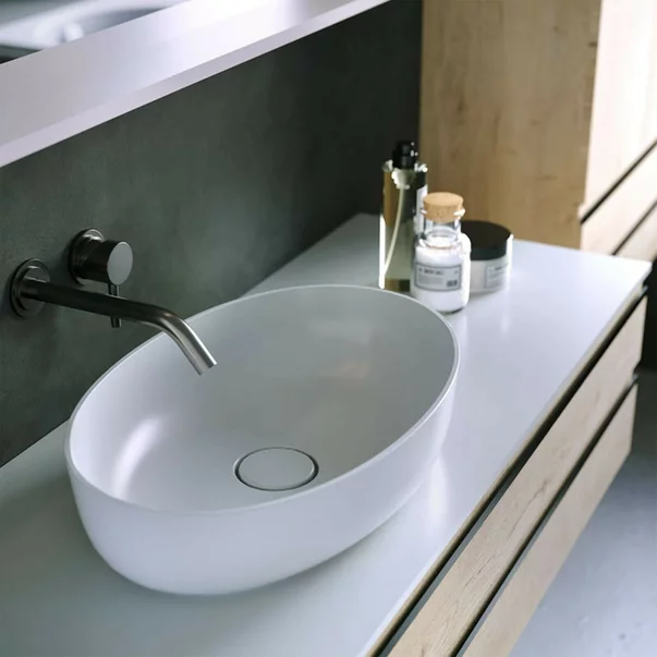 Lavoar pe blat KolpaSan Alexis 55 cm alb Detalii Lavoar pe blat KolpaSan Alexis 55 cm alb Liniile moi si subtiri ale lavoarelor ovale intrerup tiparele liniilor drepte si introduc lejeritate, ludicitate, chiar pretentiozitate. Oglinda este disponibila in combinatie cu mobilierul selectat sau ca obiect independent. Oglinda rotunda de lux adauga o nota de clasicism atemporal, ca o completare a liniilor drepte. Unul dintre considerentele importante in proiectarea gamei Alexis a fost versatilitatea baii, motiv pentru care rafinamentul estetic este completat de zonele mari de depozitare. Mobilierul Alexis este disponibil in culorile verde (Green), lemn artizanal (Craft Wood) si beton inchis (Dark Concrete).