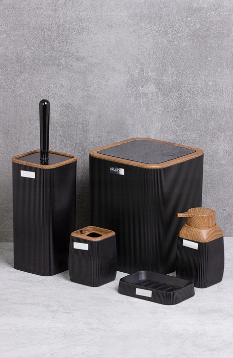 SETUL INCLUDE:   	 Cos de gunoi: 19 x 22,3 cm  	 Perie de toaleta : 10,2 x 34,2 cm  	 Dozator de sapun: 8 x 15,8 cm  	 Cana pentru periuta de dinti: 7,3 x 13 cmSapuniera: 12,6 x 9 x 2,7 cm  Setul de baie este o combinatie moderna si foarte convenabila. Este cu siguranta un set ce nu poate lipsi din baia ta. In acest set de 5 piese exista literalmente tot ce aveti nevoie pentru baie. Setul a fost creat pentru toti cei care apreciaza eleganta combinata cu simplitatea si confortul. Solid, stabil, usor de utilizat si care economiseste spatiu, setul este fabricat din plastic, cu accente de lemn de inalta calitate.