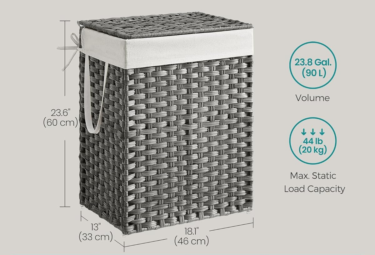 Specificatii tehnice: Brand: SONGMICS Model: ULCB51WG Material: Ratan sintetic (PP), cadru metalic, sac din bumbac Culoare: Gri Dimensiuni: 46x33x60 cm (L x l x H) Capacitate: 90 litri (23,8 galoane) Greutate maxima suportata: 25 kg Forma: Dreptunghiulara Functii speciale: Pliabil, capac cu deschidere usoara, impermeabil, bine ventilat Componente incluse: 1 x cos de rufe, 1 x sac textil detasabil, 1 x pachet accesorii, 1 x instructiuni Inchidere: Cu capac basculant Scurta descriere: Cosul de rufe SONGMICS este solutia ideala pentru organizarea discreta a hainelor murdare. Compact si elegant, acesta ofera ventilatie optima, capac cu deschidere usoara si sac interior detasabil pentru transport igienic. Este perfect pentru baie, dormitor sau spalatorie. Caracteristici principale: Capac practic pentru a ascunde rufele si a retine mirosurile Design vertical si compact pentru spatii restranse Sac interior detasabil si lavabil, cu manere laterale Material impermeabil si bine ventilat pentru igiena rufelor Cadru metalic stabil, sustine pana la 25 kg Manere laterale si design pliabil pentru depozitare usoara