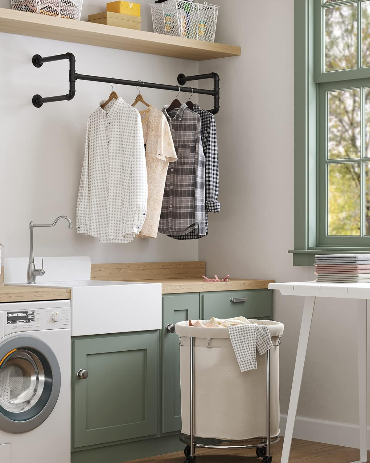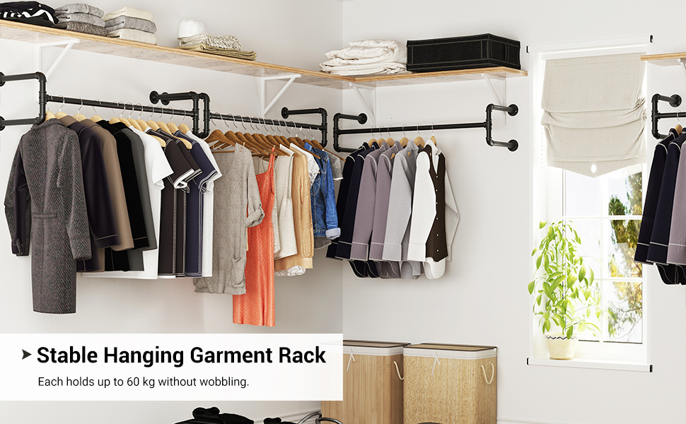 Specificatii:   	 Culoare: Negru  	 Material: otel  	 Dimensiunea produsului pentru fiecare rack: 112 x 30 x 29,3 cm (L x l x H)  	 Greutatea produsului a fiecarui rack: 2,4 kg  	 Max. Capacitatea de incarcare statica a fiecarui rack: 60 kg  	 Continutul pachetului: 2 x suport pentru haine, 2 x geanta pentru accesorii, 1 x instructiuni   Eliberati putin spatiu pe podea: doriti sa faceti ordine in hainele ingramadite din garderoba sau esarfele dezordonate din sertar? Incearca acest set de suporturi pentru haine SONGMICS! Cu o lungime de 112 cm si un design montat pe perete, ele gazduiesc o multime de haine si accesorii economisind in acelasi timp spatiu in camera.  Aceste suporturi pentru haine rezistente sunt fabricate din otel de inalta calitate. Au trecut testul de incarcare de 60 kg.   Asamblare fara probleme:  nu trebuie sa fii un expert in asamblarea acestor suporturi pentru haine, deoarece acestea vin cu rame laterale integrate si instructiuni ilustrate pentru a face asamblarea mai usoara.   4x Placi cu flansa de ancorare:  Piesele de ancorare sudate pe ramele laterale permit barei de suspendare metalice sa ofere o rezistenta mai mare (sarcina statica max. a fiecarui rack: 60 kg).   30 cm distanta fata de perete:  Distanta mai mare impiedica umerasele sa intre in contact cu peretele, astfel incat sa puteti agata hainele si sa le scoateti cu usurinta.