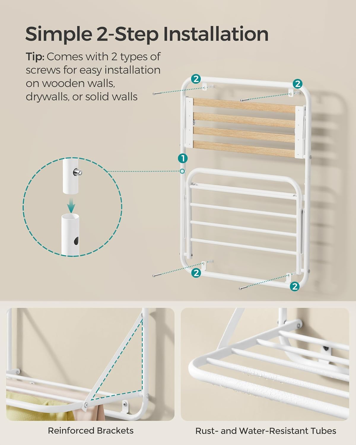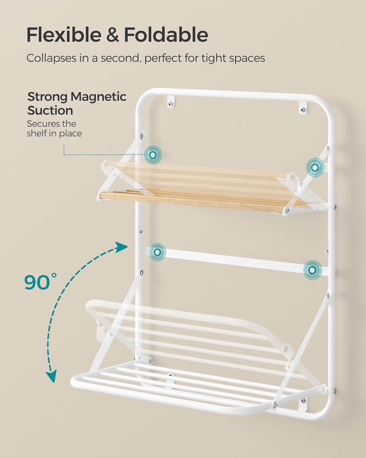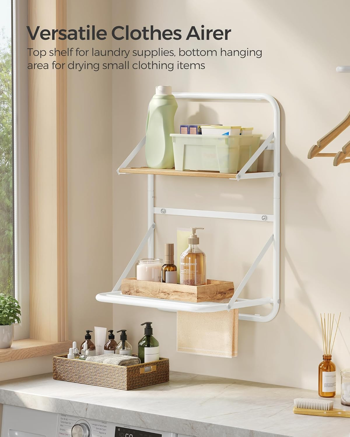Specificatii tehnice Brand: SONGMICS Material: Otel carbon Culoare: Alb cloud Dimensiuni: 26x 38 x 56 cm (pliat 3 cm adancime) Greutate maxima suportata: pana la 10 kg Functii: Suport uscare cu 5 bare, polita de depozitare, tija pentru agatare, design magnetic Scurta descriere Suportul de rufe pliabil SONGMICS este solutia practica pentru spatii mici. Conceput pentru montaj pe perete, include 5 bare pentru uscarea rufelor, o polita pentru detergenti si tije pentru accesorii. Structura din otel carbon este rezistenta, iar designul magnetic permite plierea rapida si economisirea spatiului atunci cand nu este folosit. Caracteristici principale Design pliabil cu sistem magnetic pentru economie de spatiu 5 bare pentru uscarea rufelor si accesoriilor Polita practica pentru detergenti sau cosmetice Constructie solida din otel carbon rezistent Suporta pana la 10 kg Montaj simplu cu piese marcate si instructiuni clare Ideal pentru baie, bucatarie sau spatii mici