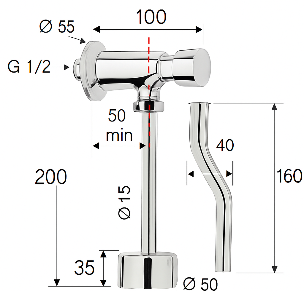 Robinetul temporizat TE855 de la Remer Rubinetterie este special conceput pentru spalarea pisoarelor cu alimentare de sus, in spatii publice sau comerciale. Fabricat din alama sanitara cu finisaj cromat lucios, ofera rezistenta la uzura si coroziune. Montajul pe perete cu racord standard G 1/2″ asigura compatibilitate si instalare simpla. Timpul de deschidere controlat (aproximativ 6-8 secunde) contribuie la economia de apa si functionare eficienta. Designul este robust si adaptat utilizarii intensive, oferind solutie durabila pentru grupuri sanitare.