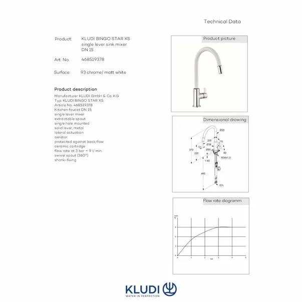 Baterie bucatarie alb mat Kludi Bingo Star XS cu pipa extractibila Detalii Baterie bucatarie alb mat Kludi Bingo Star XS cu pipa extractibila Bateriile Kludi Bingo Star XS au o structura ideala care imbina forme perfecte finisand interiorul cu linii indraznete. Forma puternica a bateriei Bingo Star combinata cu arcurile de cerc gratioase atrag toate privirile. O baterie Kludi Bingo Star XS este o formula estetica pentru un design armonios. Gama Bingo Star XS a fost creata pentru oamenii care considera ordinea si designul valorii pe care si le doresc de la casa lor. Intr-un interior bine organizat, fiecare forma este aliniata perfect fiecarui detaliu, iar elementele sunt cu maiestrie coordonate. O baterie Kludi Bingo Star XS va complementa un design de interior geometric, asigurand un contrast minunat intr-o schema de amenajare moderna cu accente minimaliste. Fiecare baterie este parte din viata de zi cu zi, ajutandu-te sa ai un grad mai mare de confort si o utilizare facila si placuta. Chiar si atunci cand o folosesti pentru cele mai simple lucruri cotidiene vei aprecia formele ergonomice si posibilitatile multiple de a utiliza apa.