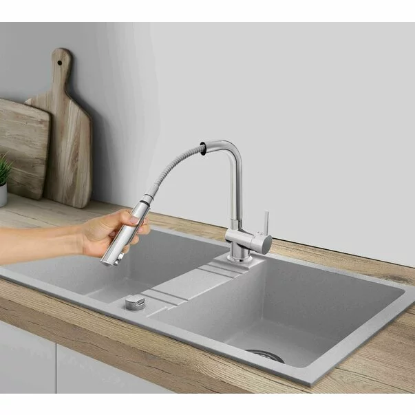 Baterie bucatarie cu dus extractibil crom Ferro Toledo Detalii Baterie bucatarie cu dus extractibil crom Ferro Toledo Fiecare baterie este parte din viata de zi cu zi, ajutandu-te sa ai un grad mai mare de confort si o utilizare facila si placuta. Chiar si atunci cand o folosesti pentru cele mai simple lucruri cotidiene vei aprecia formele ergonomice si posibilitatile multiple de a utiliza apa.
