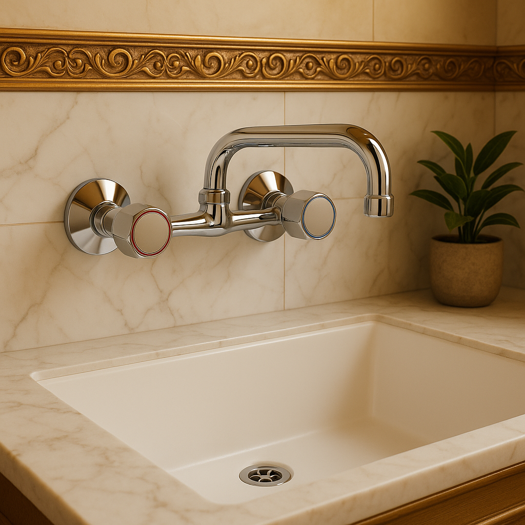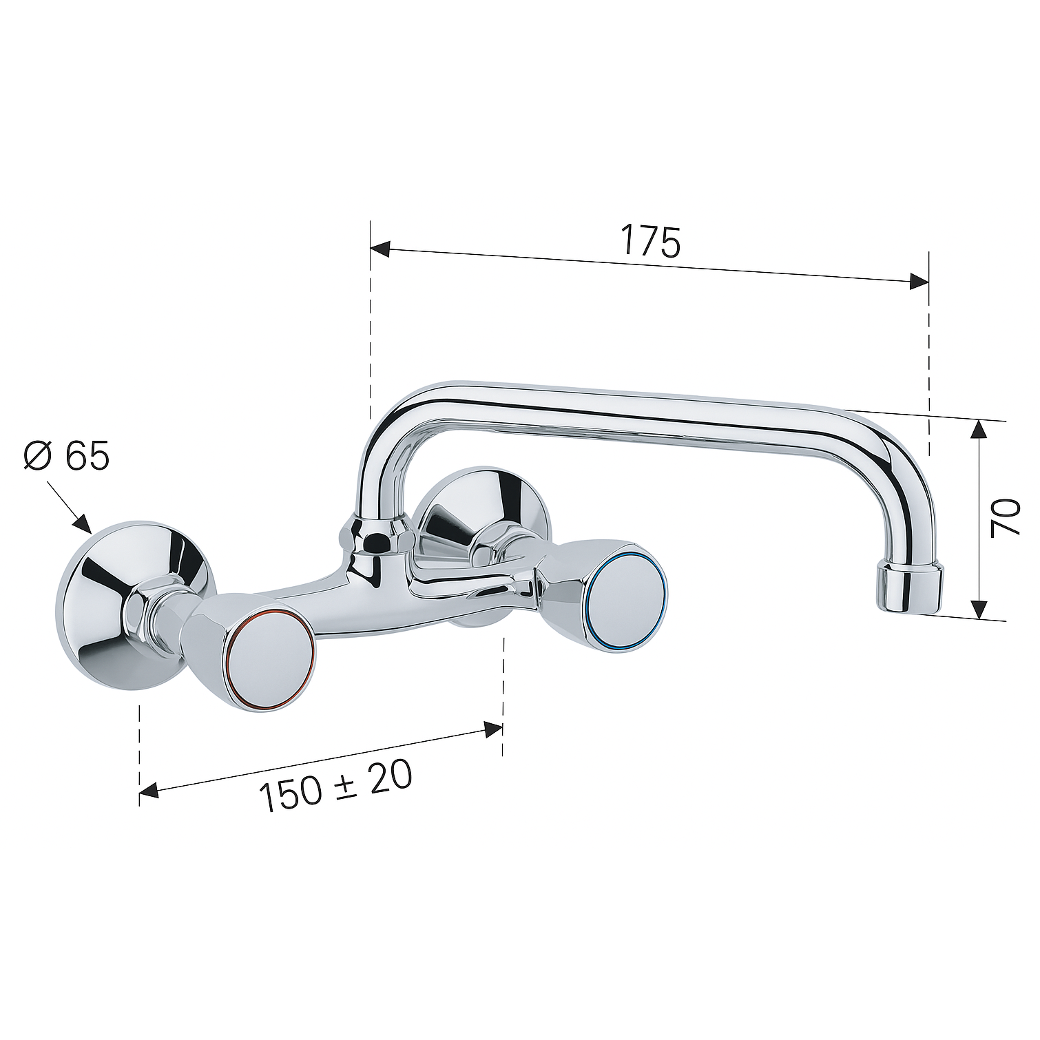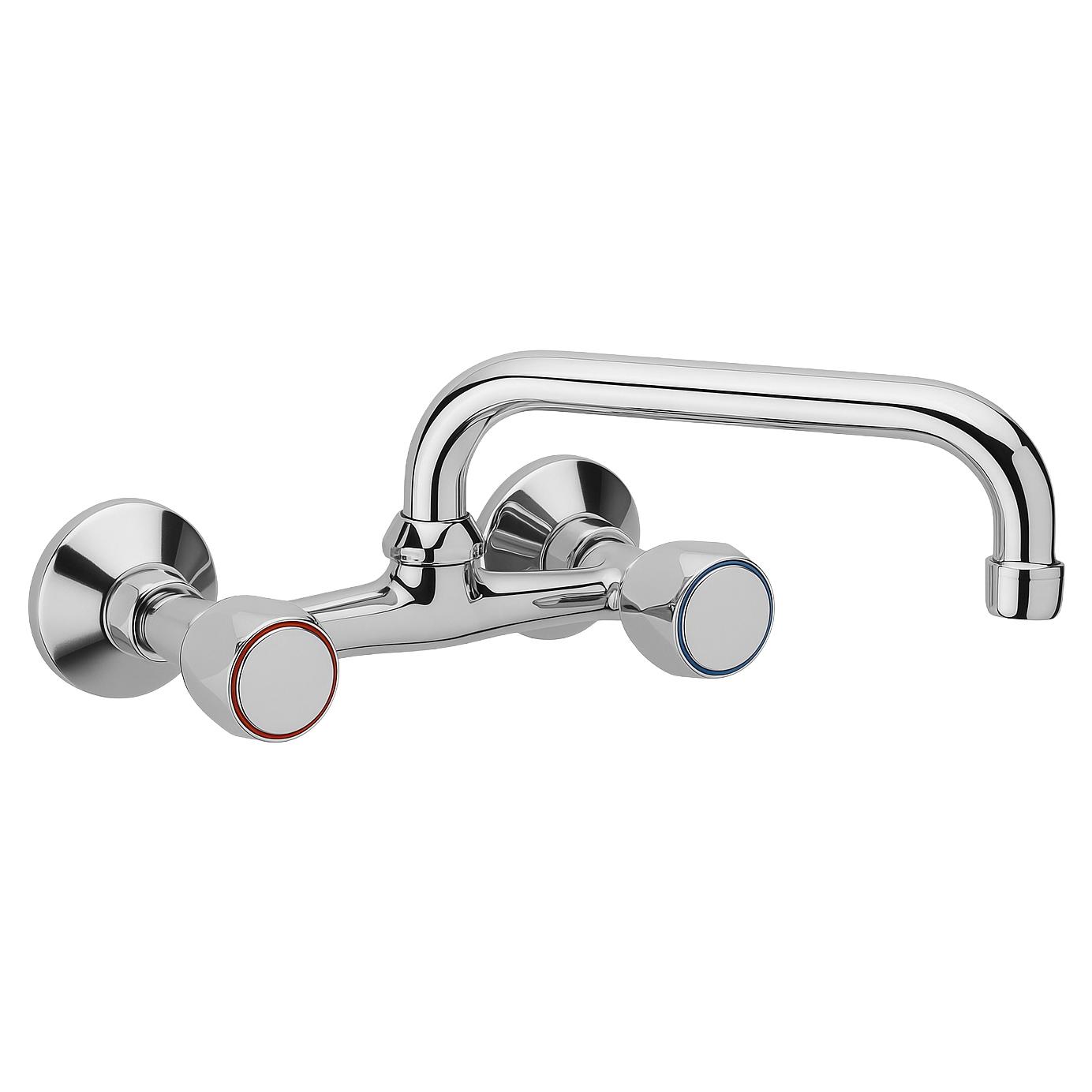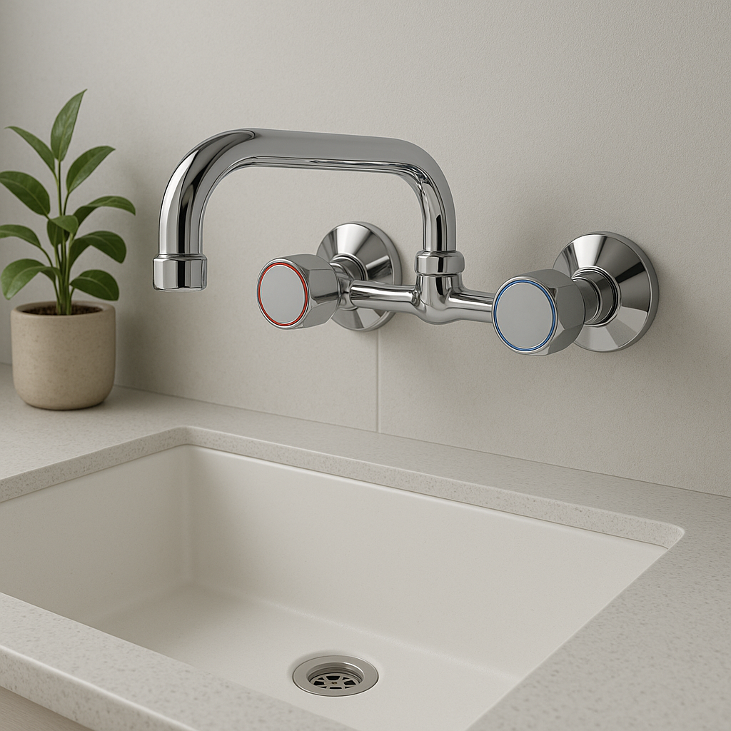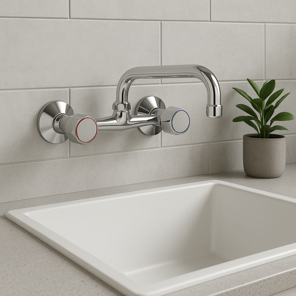 Bateria se monteaza pe perete si este prevazuta cu pipa pivotanta, ideala pentru chiuvetele de bucatarie, asigurand confort in utilizare si acces facil in zona de spalare. Robinetii sunt marcati cu inel rosu (apa calda) si albastru (apa rece) pentru o utilizare intuitiva.