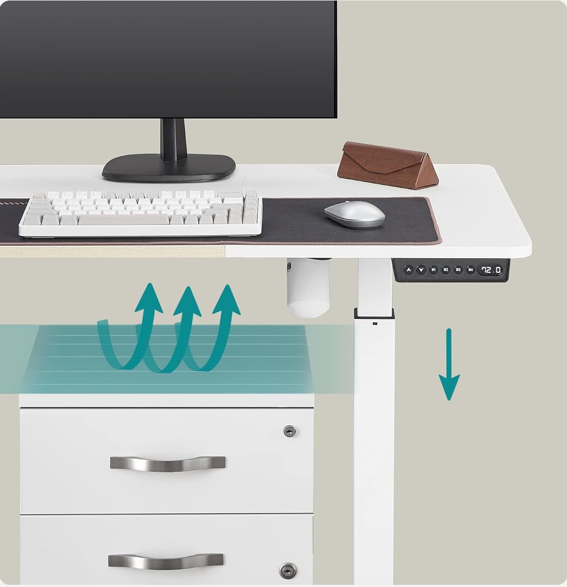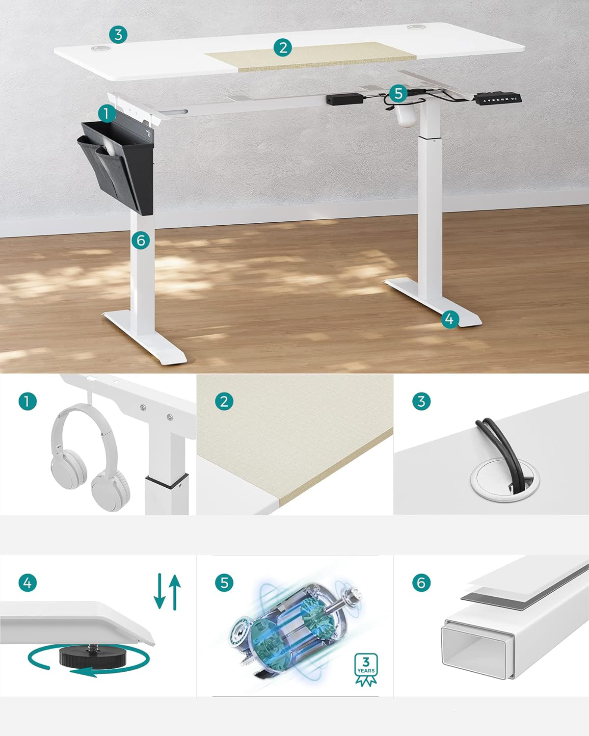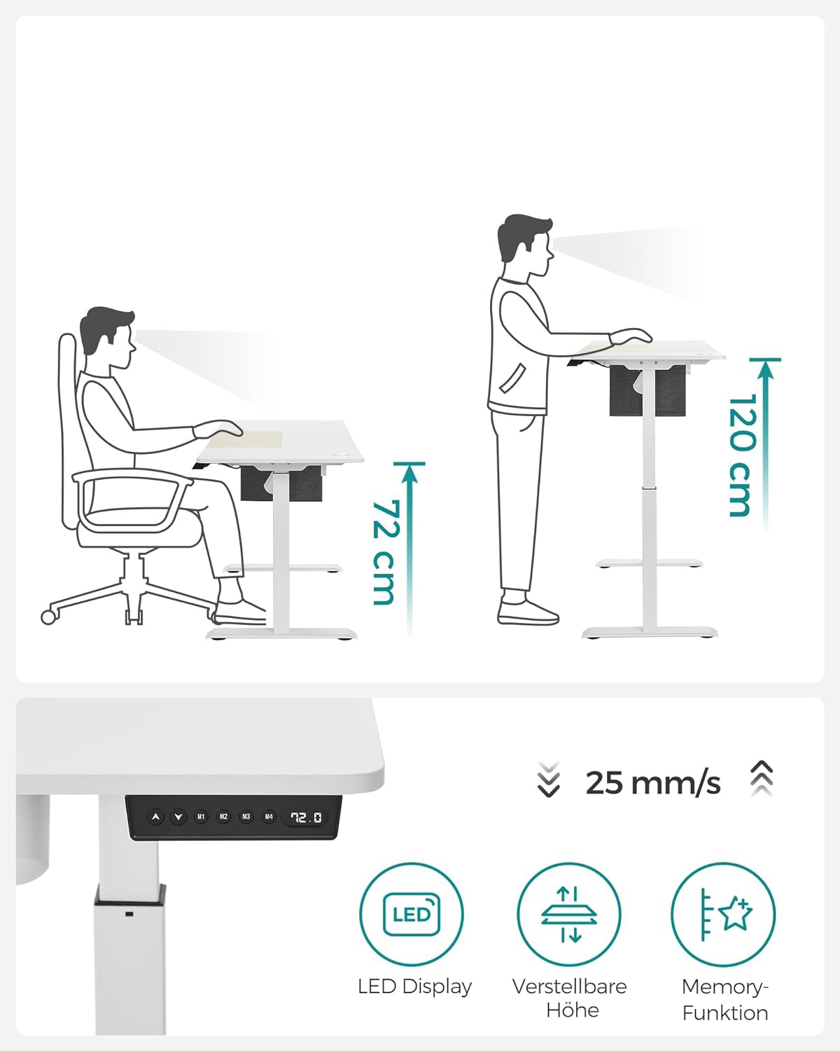 Detalii produs: Culoare: alb. Material: Placi aglomerate din lemn, otel, tesatura netesuta. Dimensiuni: 60 x 140 x (72-120) cm (D x W x H). Grosimea blatului mesei: 1,5 cm. Greutate: 28 kg. Capacitate de incarcare statica: 80 kg Despre acest articol Puteti regla inaltimea biroului electric intre 72 si 120 cm si puteti stoca 4 inaltimi preferate. Exista, de asemenea, un sistem de protectie la plimbare.Buzunar textil pe partea stanga sau dreapta pentru carti, reviste si multe altele, 3 carlige pentru casti si genti, 2 prize pentru o buna gestionare a cablurilor. Nimic nu va favorizeaza mai mult concentrarea decat un birou ordonat!Placa imbinata in alb de baza si bej confera acestui suport de birou mai mult stil, iar textura asemanatoare tesaturii din zona bej a blatului ofera o senzatie de confort. Piesele marcate si instructiunile ilustrate usor de urmat asigura o asamblare fara efort. Acest birou electric cu cadru robust din otel poate sustine pana la 80 kg.