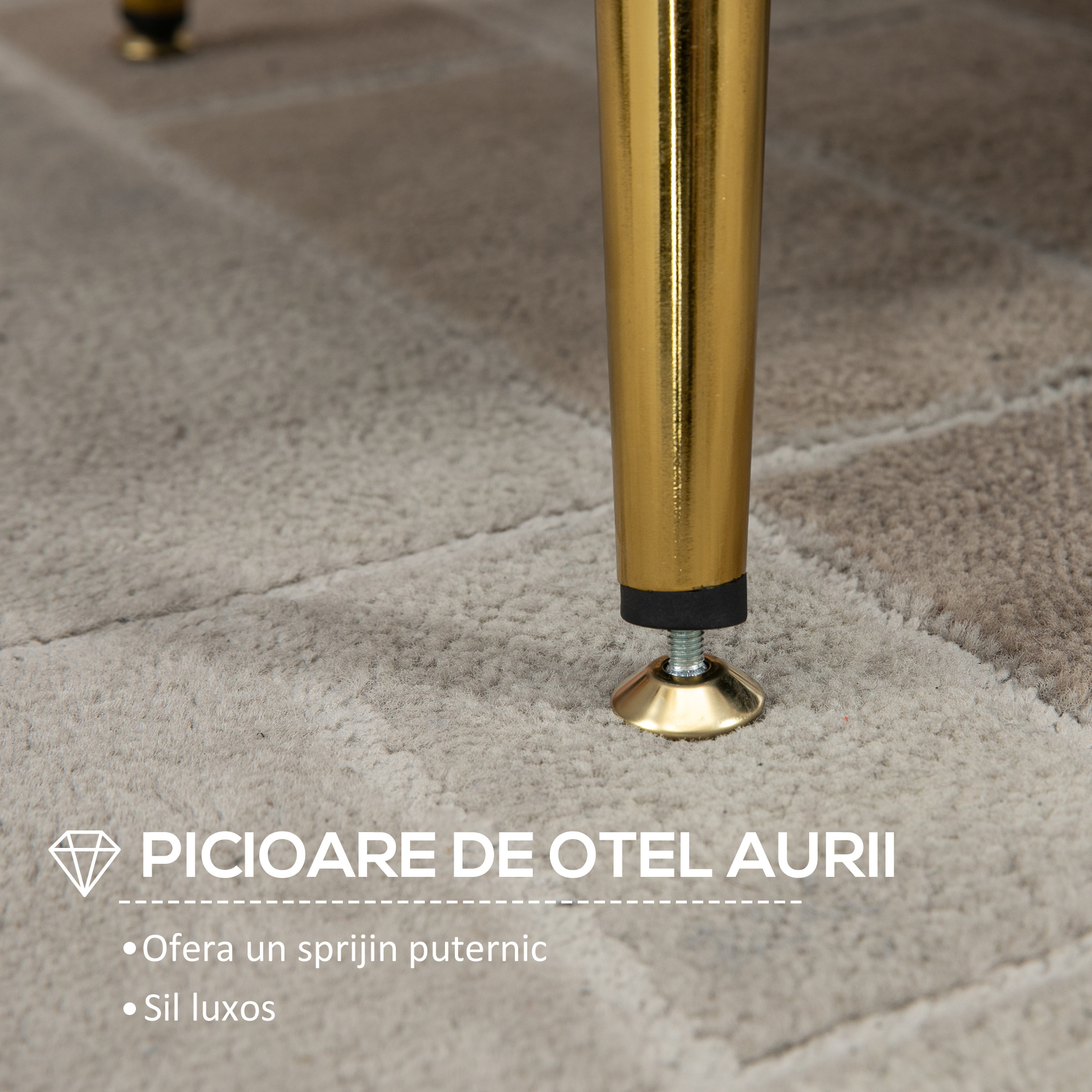 - Picioare din metal auriu pentru o nota vintage.