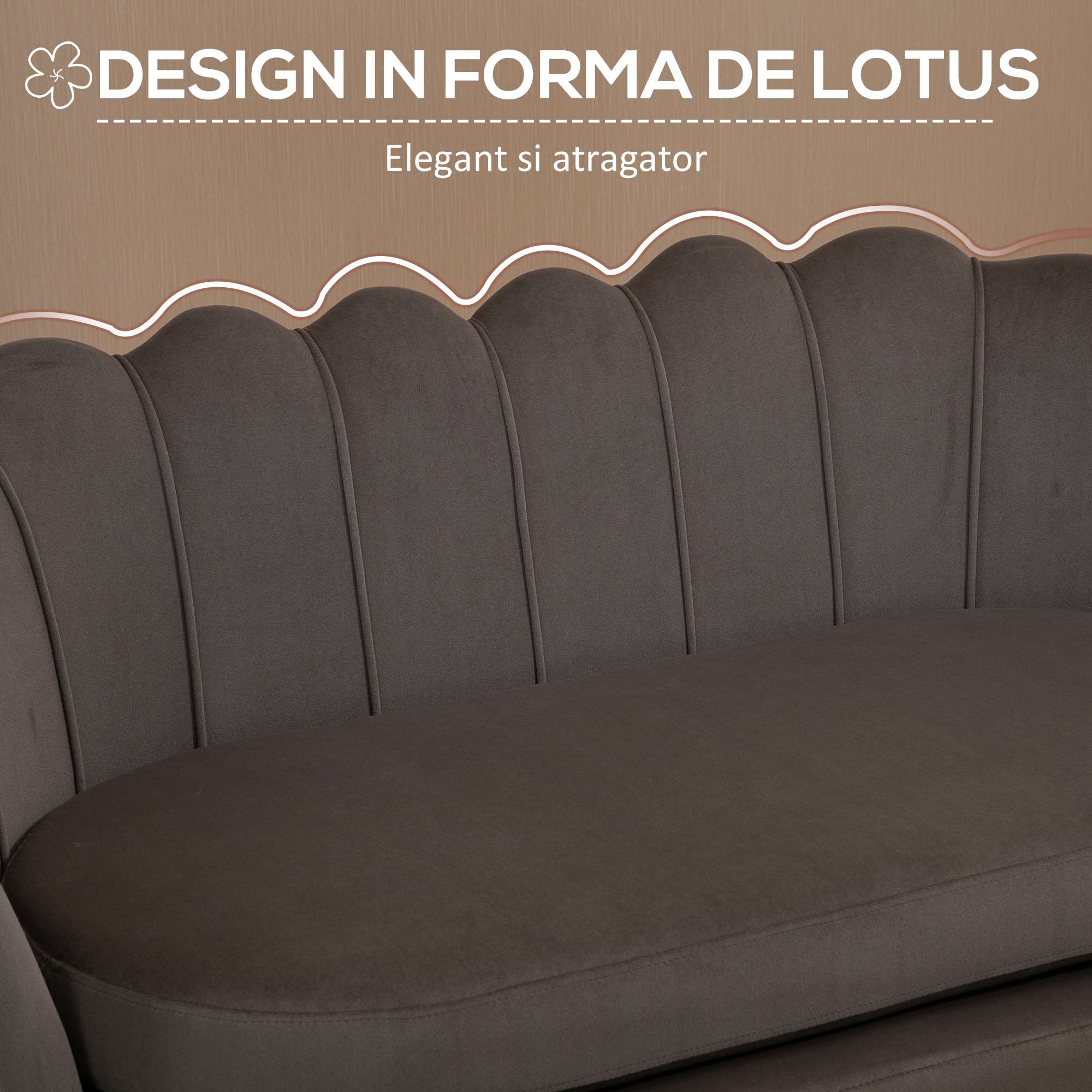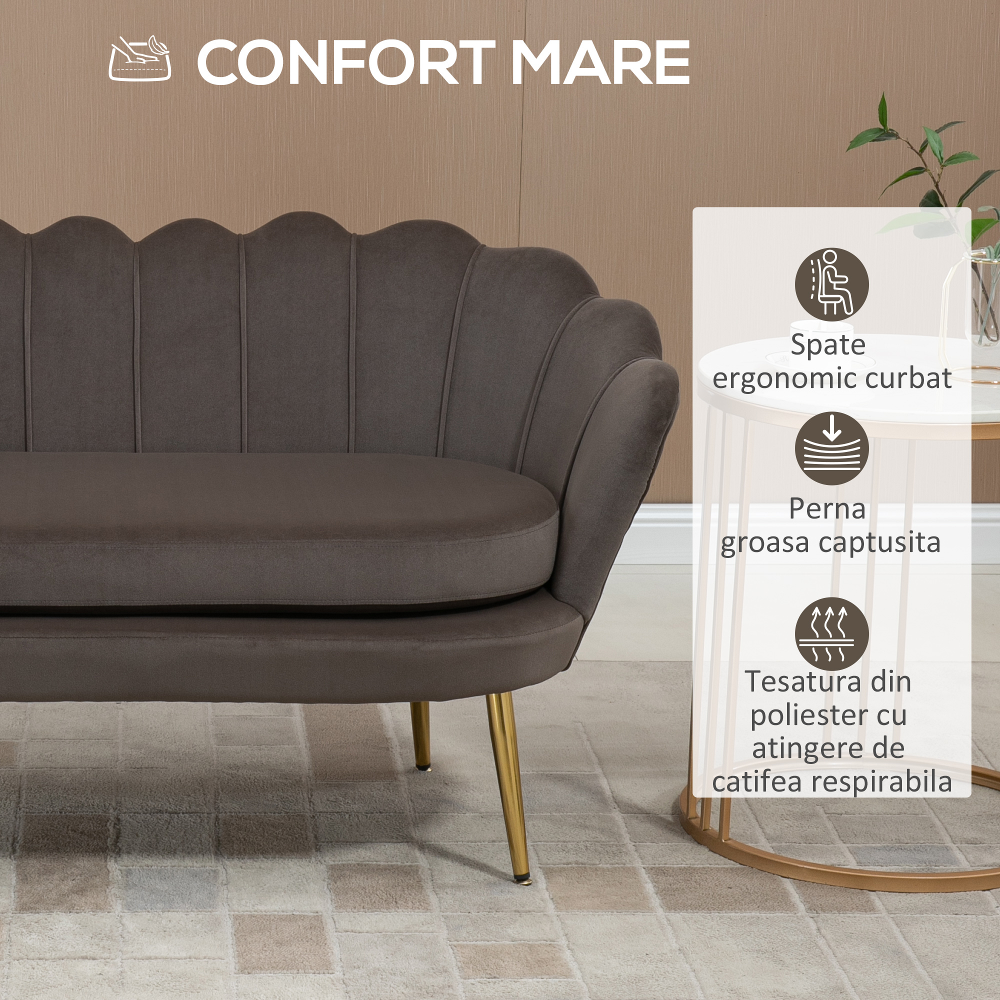 [BRAND NAME] canapea din catifea, 2 locuri,130x63x73 cm, maro este canapeaua din care nu veti mai dori sa va ridicati prea repede. Este moale, fina, placuta la atingere si va ofera confort sporit. Are o forma compacta, design modern, fiind realizata cu mare atentie la detalii. Veti observa asadar ca are cusaturi decorative, spatar curbat, cu picioare aurii si lucioase. La atingere este catifelata. [BRAND NAME] canapea din catifea, 2 locuri, 130x63x73 cm, maro are finetea acestui material care va rasfata de fiecare data cand o veti folosi. Are captuseala groasa, material ce face ca sederea aici sa va priasca. sezutul este dublat de o perna moale, invelita in acelasi tip de material, catifeaua maro. [BRAND NAME] canapea din catifea, 2 locuri, 130x63x73 cm, maro poate fi alegerea potrivita in spatii sofisticate, elegante, acolo unde doriti sa puneti un accent pe designul interior. Mai mult decat o completare in spatiul vostru, aceasta canapea este trainica si atemporala. Bucurati-va de confort la maximum!