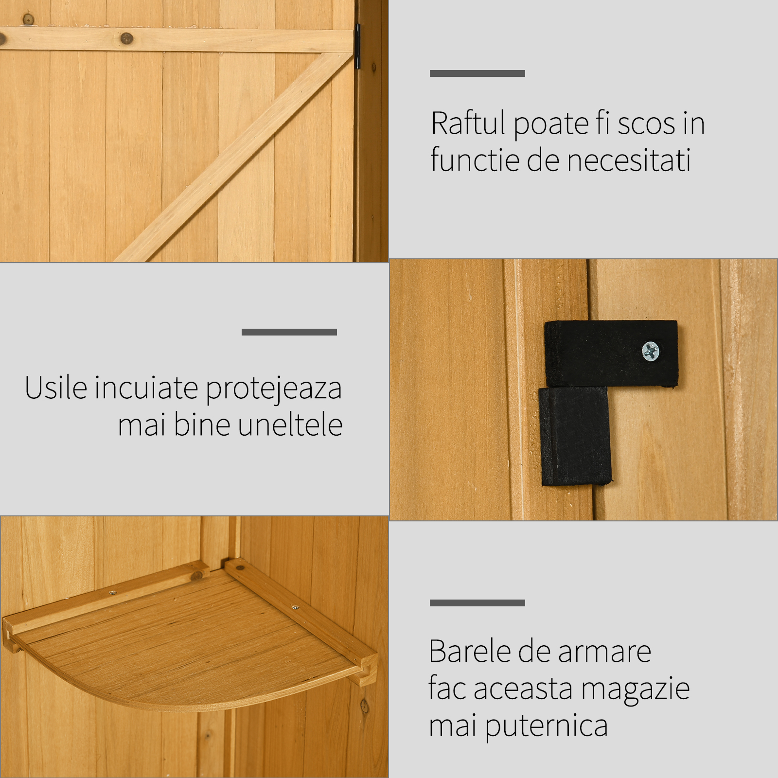 • STABILITATE sI DURABILITATE iN EXTERIOR: Cadrul din lemn masiv ofera rezistenta si durabilitate in timp, iar magazia este proiectata sa ramana stabila si functionala in conditii variate de vreme - o solutie fiabila pentru depozitare pe termen lung in curte sau gradina.