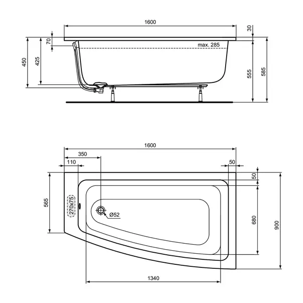 Specificatii tehnice Cada asimetrica Ideal Standard i.life cu montaj dreapta 160X90 cm alb lucios: