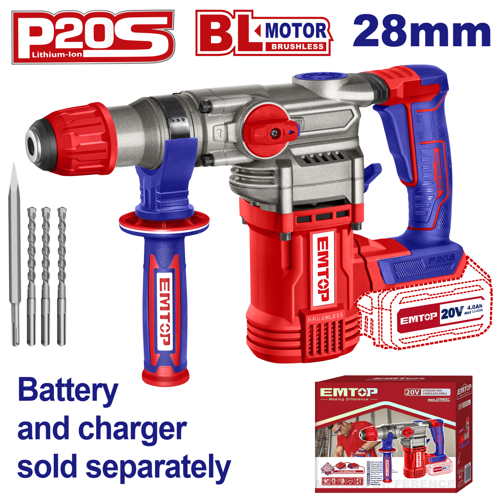 EMTOP Ciocan rotopercutor fara acumulator si incarcator, 28mm, 4 accesorii - ELRH20288, EMTOP