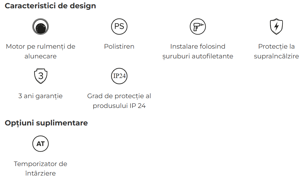 Ventilatorul include o protectie la supraincalzire, asigurand o functionare sigura si fiabila.