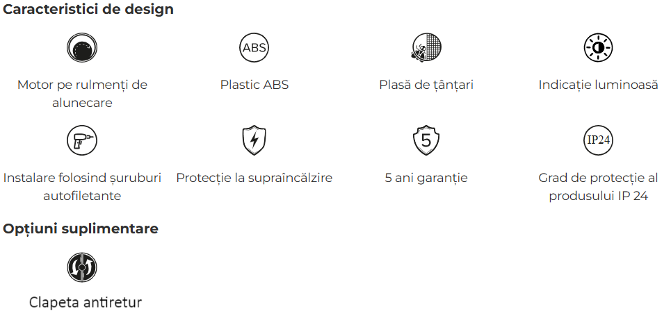 Carcasa si rotorul sunt fabricate din plastic ABS de inalta calitate, rezistent la umezeala, coroziune si raze UV, ceea ce garanteaza durabilitate pe termen lung. Toate modelele sunt echipate cu plasa anti-insecte si indicator luminos pe panoul frontal, care semnalizeaza functionarea.