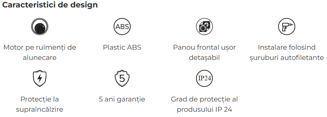 • Potrivit pentru ventilatia constanta sau periodica a bailor, bucatariilor, dusurilor si altor spatii casnice