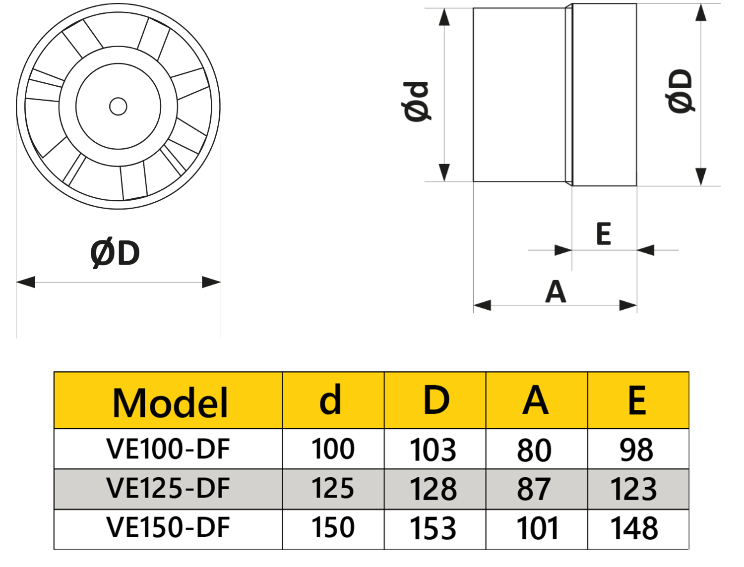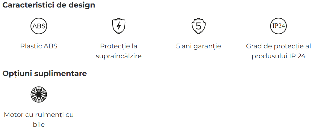 Gradul de protectie IP24 permite utilizarea ventilatorului in incaperi cu umiditate ridicata, iar designul compact il face usor de montat in tubulatura rotunda cu diametrul de 100 mm sau direct in guri de ventilatie.