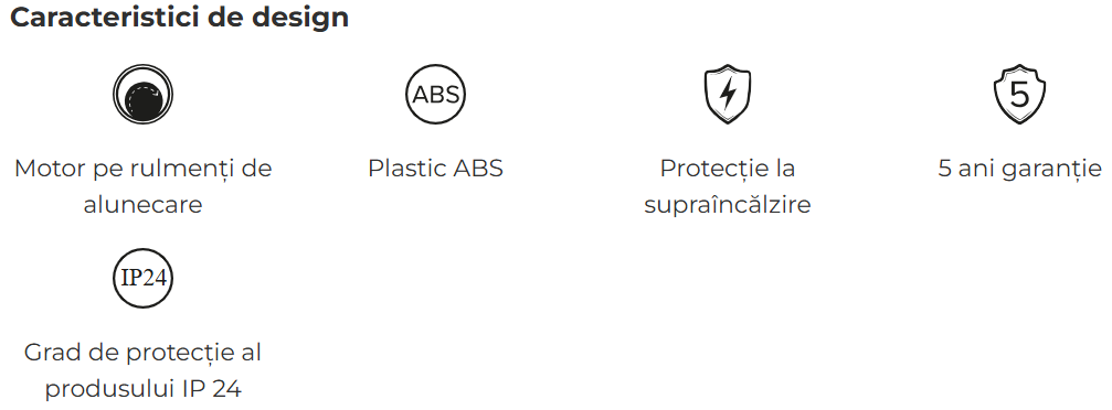 Carcasa si rotorul sunt fabricate din plastic ABS de inalta calitate, rezistent la coroziune, socuri mecanice si raze UV. Motorul axial este dotat cu protectie la supraincalzire, oferind siguranta si o durata de viata extinsa, fara a necesita intretinere suplimentara.