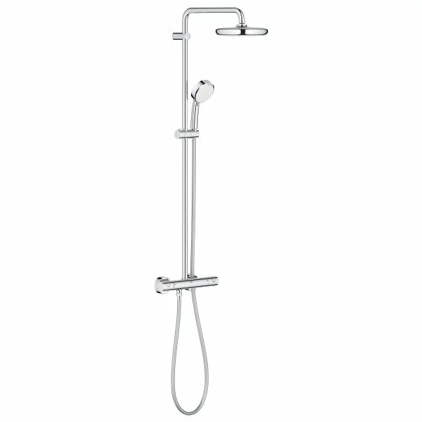Coloana de dus cu baterie termostatata Grohe Tempesta Cosmopolitan 210 Detalii Coloana de dus cu baterie termostatata Grohe Tempesta Cosmopolitan 210 GROHE New Tempesta Cosmopolitan - Alegerea ideala pentru baia moderna! New Tempesta Cosmopolitan este alegerea ideala pentru baile moderne, elegante, multumita formei sale simple, cilindrice si a muchiilor tesite. Poti alege intre trei modele de dusuri de mana si un dus fix cu patru tipare de pulverizare. Tehnologia GROHE DreamSpray garanteaza placere maxima la dus, indiferent daca faci un dus dimineata devreme sau un dus relaxant la final de zi. Perele de dus din aceasta serie sunt dotate cu o suprafata cromata GROHE StarLight usor de intretinut, care garanteaza o stralucire durabila.