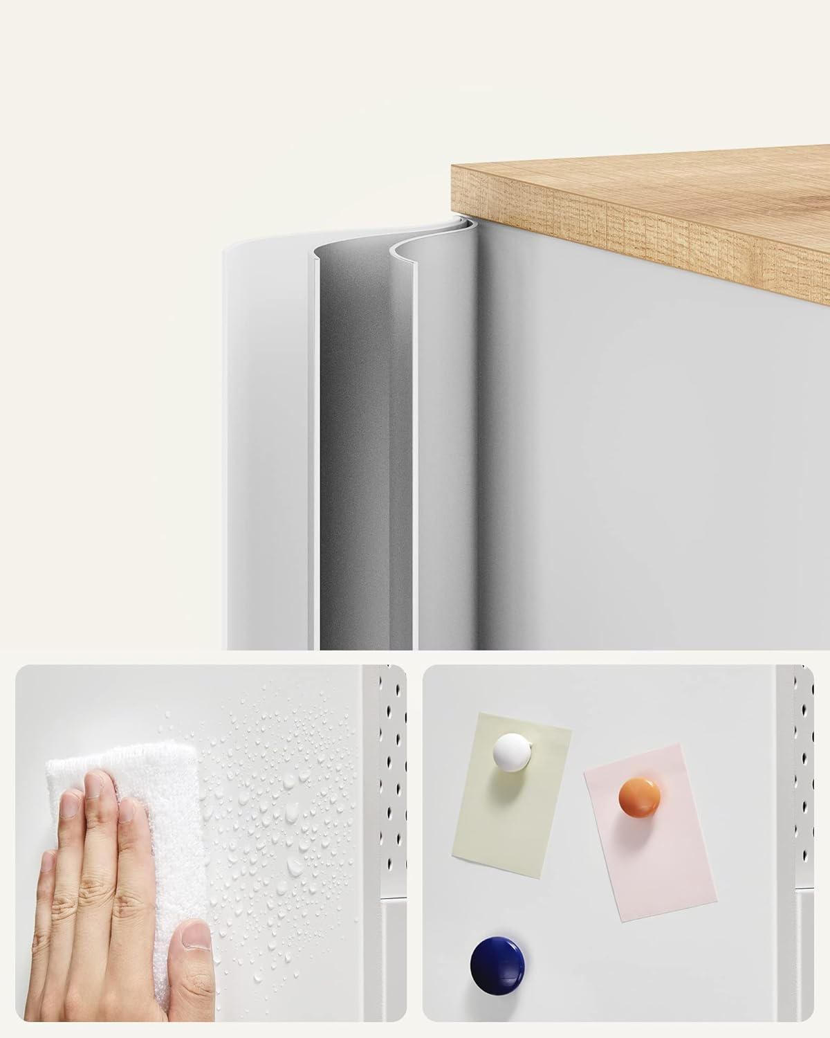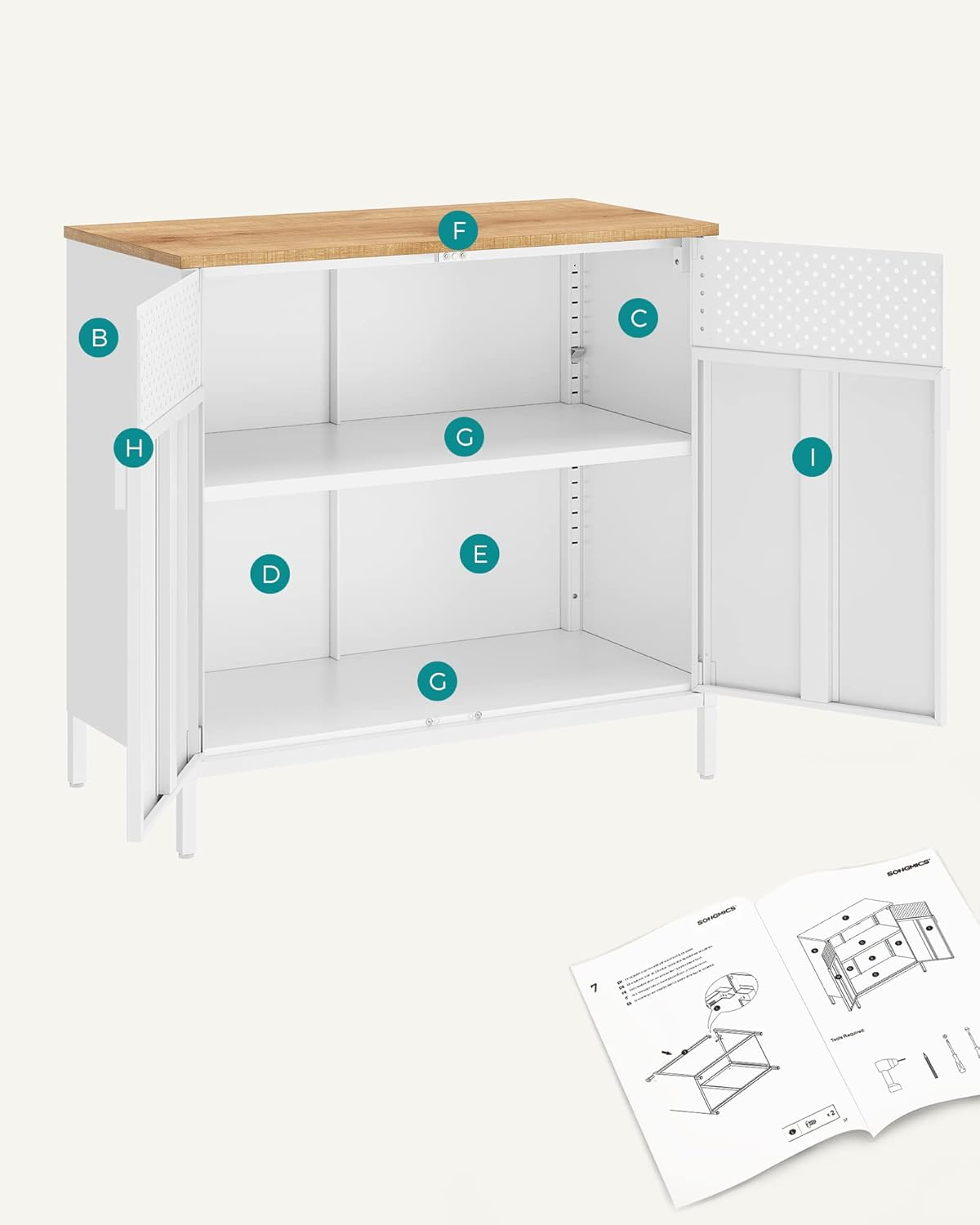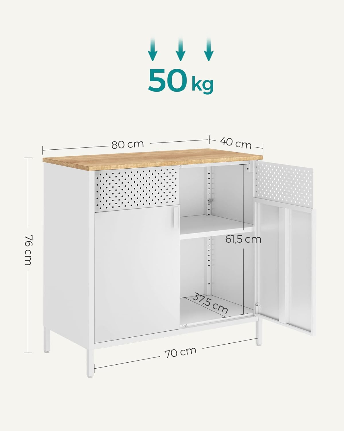 Dulap de depozitare cu structura metalica si usi duble, potrivit pentru organizarea obiectelor in living, bucatarie sau alte spatii din locuinta. Raftul interior reglabil permite adaptarea spatiului in functie de inaltimea obiectelor depozitate, iar designul simplu se integreaza usor in diferite amenajari.