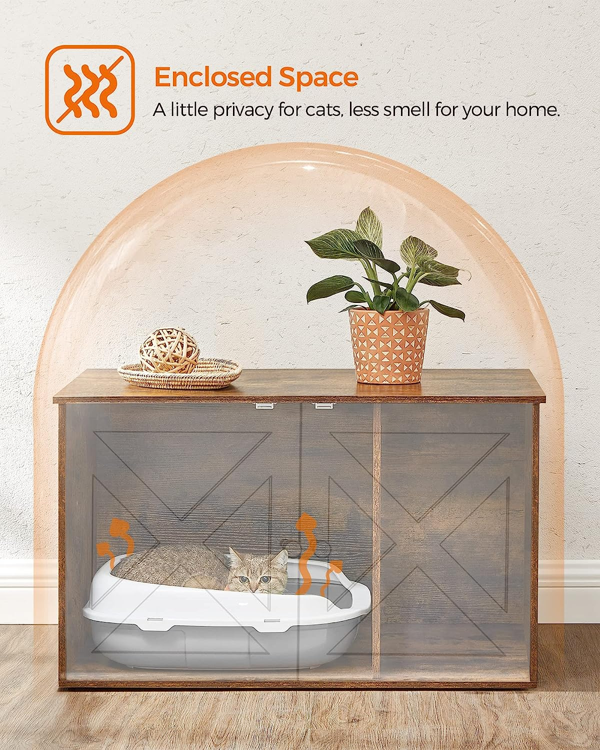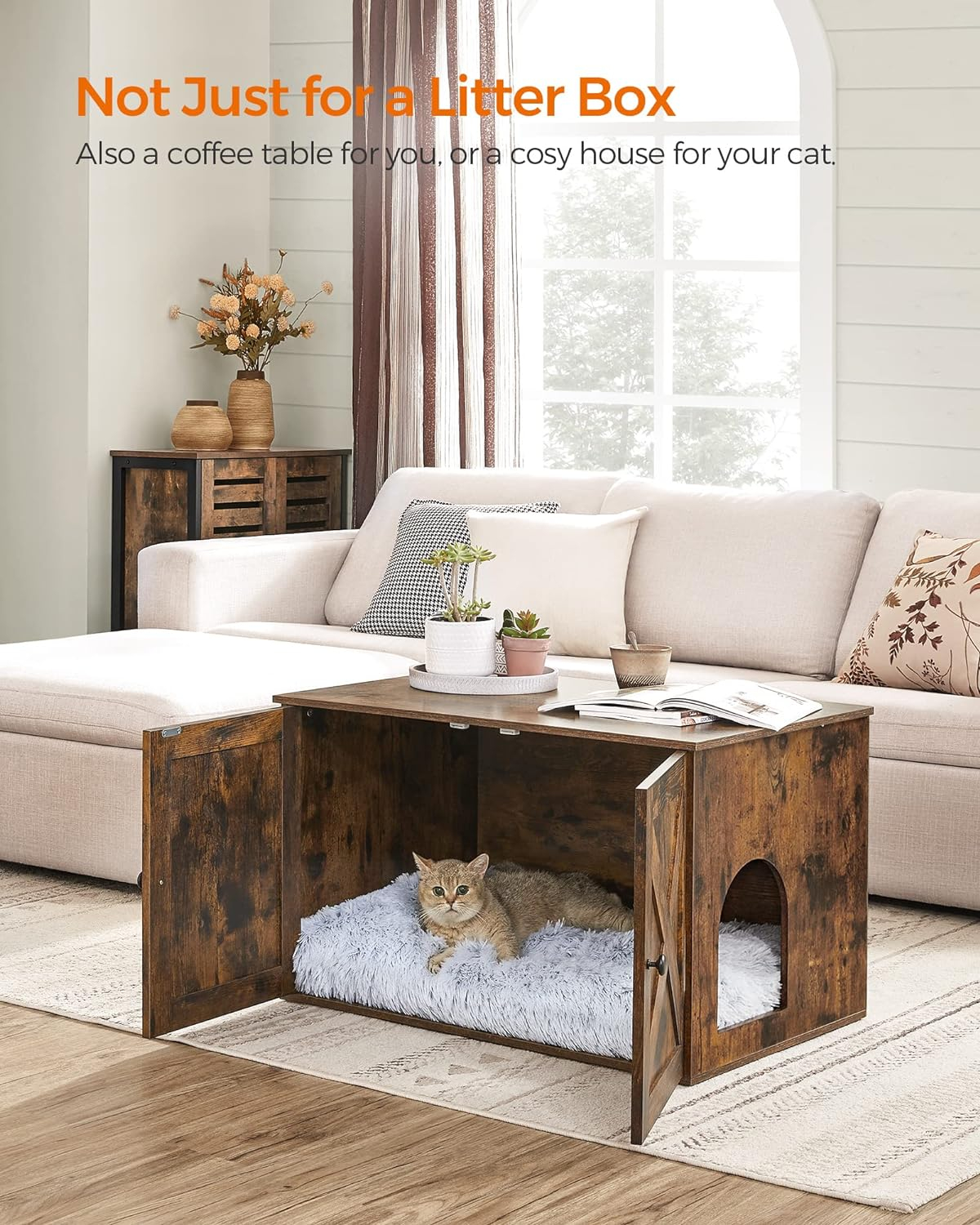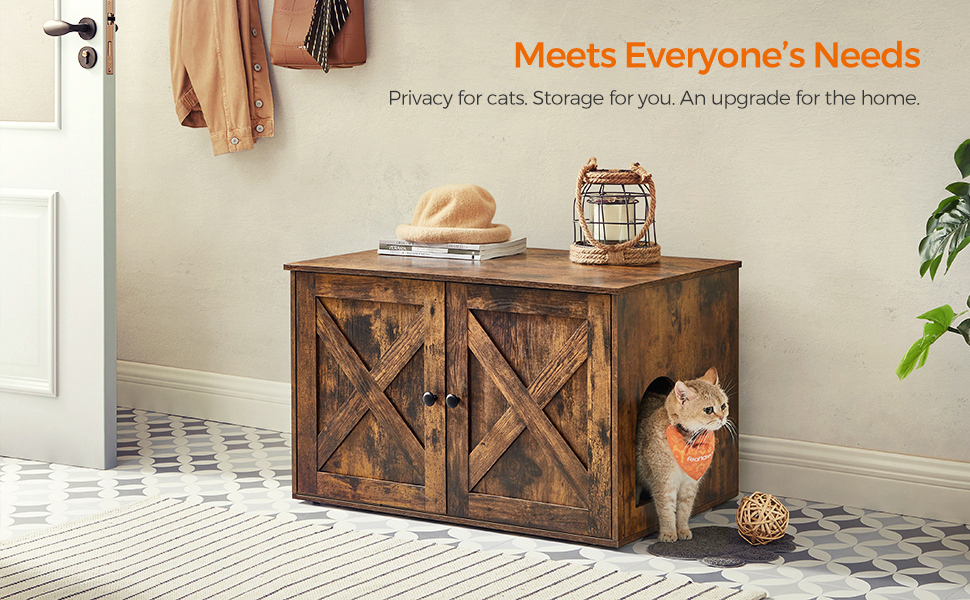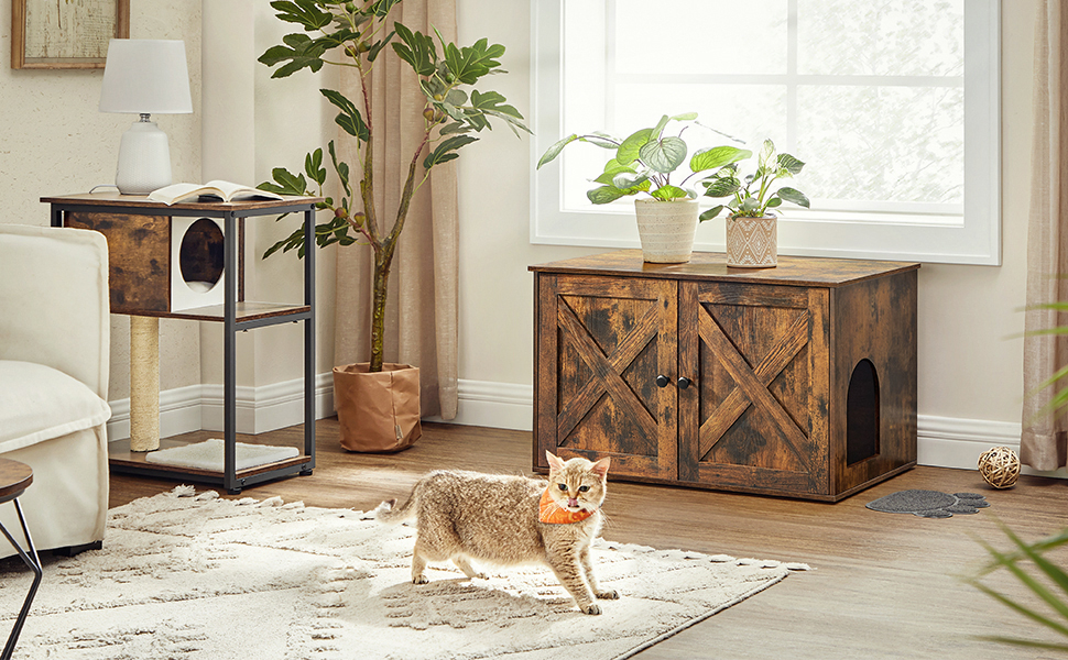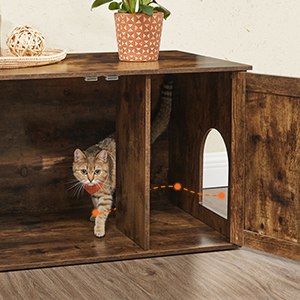 Detalii despre produs: Culoare: Maro Materiale: Placi aglomerate Dimensiuni: 80 x 53 x 49,2 cm (L x l x i). Greutate: 15,8 kg Capacitate de incarcare statica a suprafetei (cu separator): 60 kg Capacitate de incarcare statica a placii de baza: 30 kg Despre acest articol Cu stilul sau rustic si usile elegante de hambar, aceasta litiera se integreaza cu usurinta in locuinta dumneavoastra.Datorita constructiei inchise, aceasta litiera pentru pisici ofera un loc privat unde pisica dvs. se simte in siguranta pentru a-si face urgentele si mai putina mizerie - o solutie avantajoasa pentru ambele parti!Cu o dimensiune de 50 x 50 x 46 cm, compartimentul principal al acestui dulap pentru pisici ofera suficient spatiu pentru pisici. De asemenea, puteti indeparta separatorul pentru a mari suprafata la 74,9 x 50 x 46 cm.Un singur produs, mai multe utilizari: Plasati inauntru o litiera pentru pisici, folositi-o ca masa laterala sau plasati un pat pentru pisici inauntru pentru a crea un adapost confortabil.Cu instructiuni pas cu pas si piese etichetate, aceasta litiera pentru pisici este gata in 20 de minute.