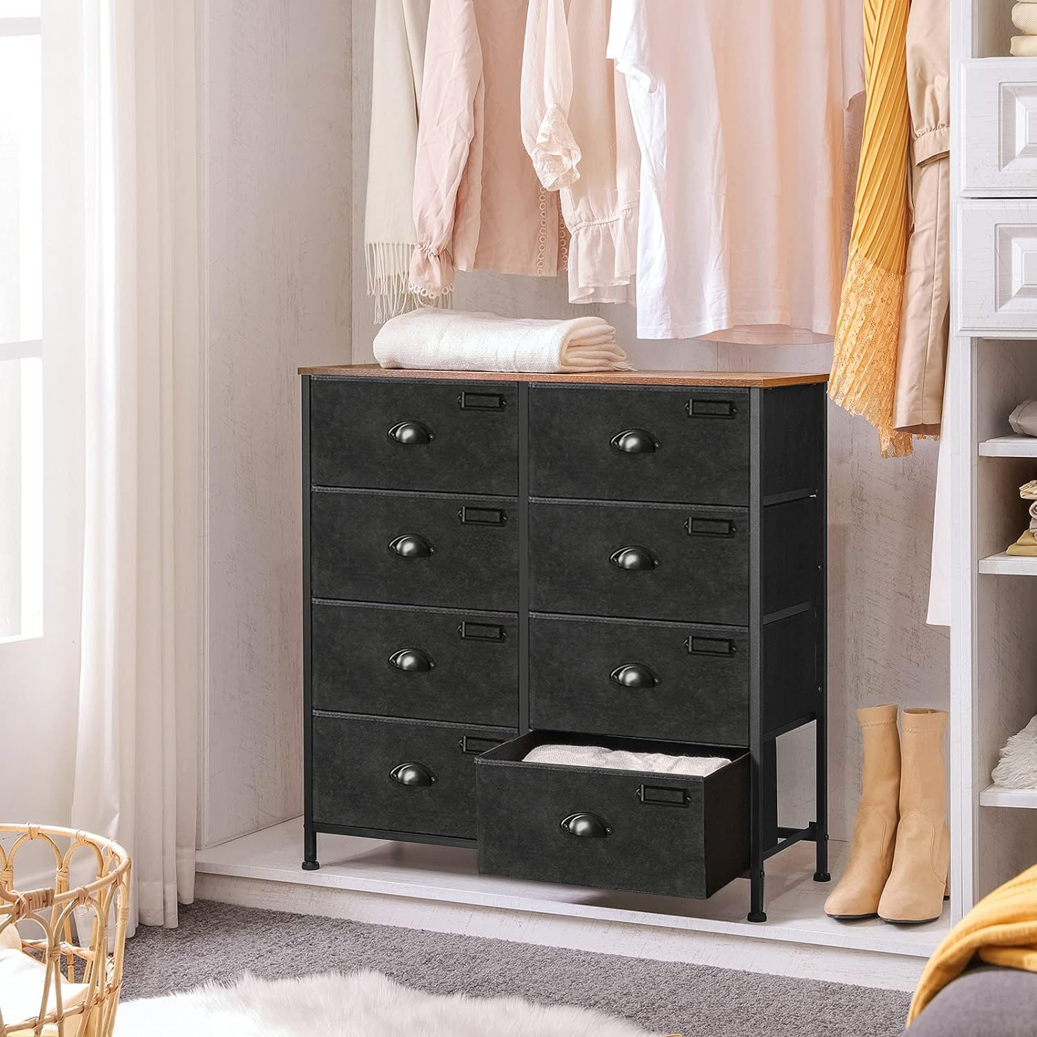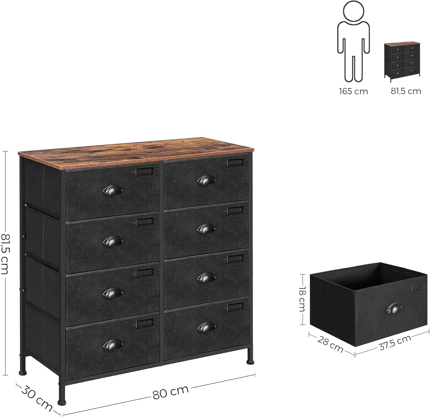 Specificatii: Culoare: Maro rustic, negru Material: MDF (panou de fibre de densitate medie), metal, fata din tesatura de piele de caprioara, fund din tesatura Oxford Dimensiunea produsului: 80 x 30 x 81,5 cm (L x l x i) Greutatea produsului: 10 kg Max. Capacitate de incarcare statica a blatului de masa: 15 kg Max. Capacitate de incarcare statica a fiecarui sertar: 3 kg Despre acest articol La revedere haos! Aceasta comoda spatioasa din stofa cu 8 sertare va va ajuta sa va faceti ordine in casa.Cu etichete pe fiecare sertar, este mult mai usor sa gasiti ceea ce aveti nevoie.O suprafata rustica, combinata cu un cadru metalic negru, da viata unui stil industrial fermecator. Dar cum ramane cu detaliile? Partea frontala din piele de caprioara falsa si manerele metalice sunt cireasa de pe tort!Tesatura, metal si lemn prelucrat: Acest trio de soc lucreaza mana in mana pentru a va oferi o comoda stabila, durabila si in acelasi timp usoara, pregatita sa sustina colectia dvs. de haine.Este livrat cu instructiuni detaliate si cu instrumentul de asamblare necesar pentru o montare usoara.