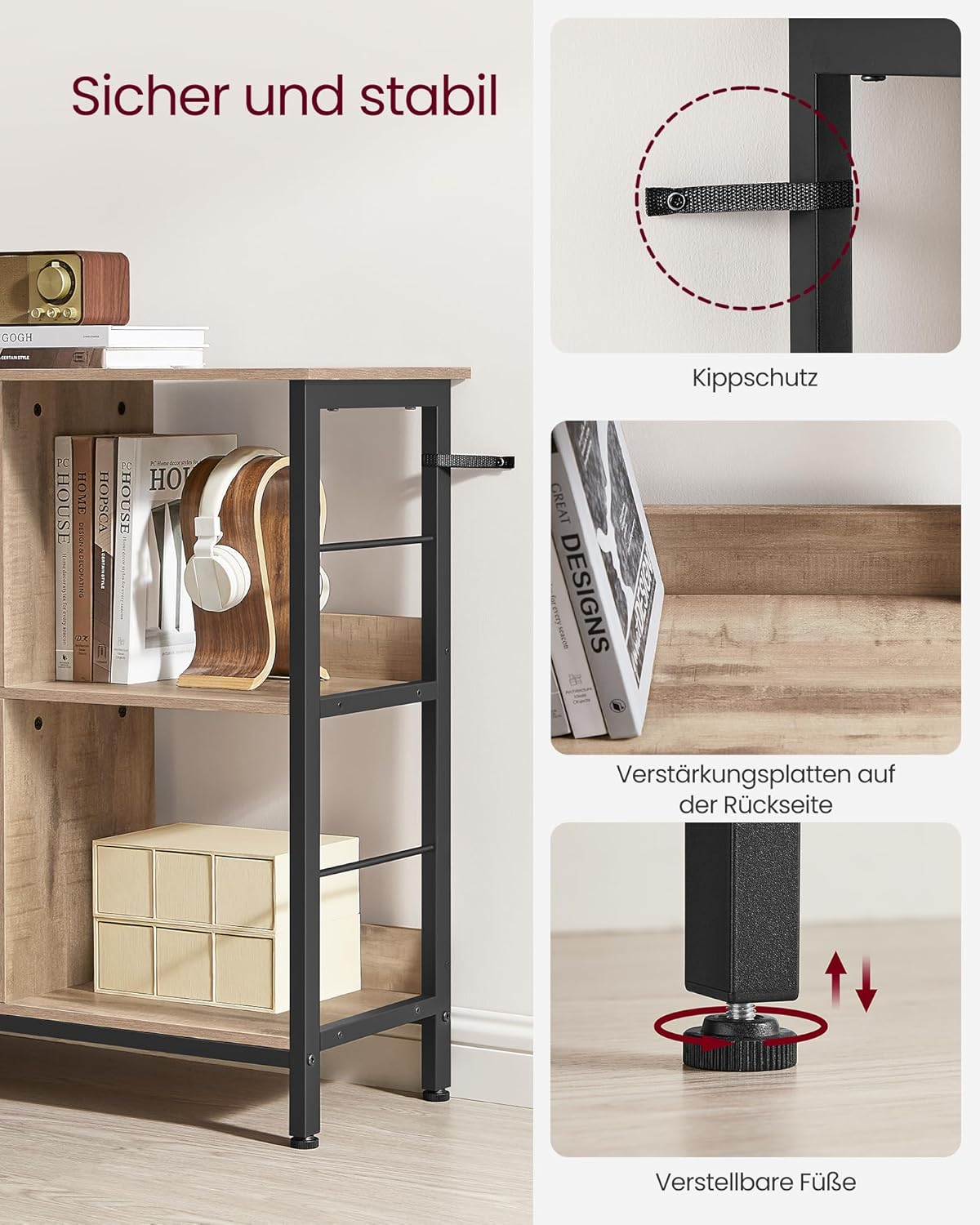 Detalii despre produs: Culoare: gri - negru cernealaMaterial: PAL, otelDimensiuni: 33 x 120 x 80 cm (D x W x H)Greutate: 17,8 kgCapacitate maxima de incarcare statica in total: 40 kg Livrare: 1 x raft vertical1 x pachet de accesorii1 x dispozitiv anti-basculare1 x manual de instructiuni Note VASAGLE: Din motive de siguranta, va rugam sa atasati aceasta biblioteca la perete cu ajutorul kitului inclus de anti-rasturnare Rustic industrial Amestecul elegant de maro camel si negru creeaza o ambianta vintage si industriala, facand din aceasta biblioteca rolul principal al casei dvs. Depozitare Aceasta biblioteca cu 6 cuburi va satisface toate nevoile. Poate fi folosita in camera de zi pentru expunerea decoratiunilor, in birou pentru depozitarea cartilor sau in bucatarie pentru depozitarea sticlelor si borcanelor Stabila si robusta Marginile ridicate de pe spate si barele de otel de pe laturi ofera un plus de stabilitate. Datorita picioarelor reglabile, totul este bine echilibrat chiar si pe suprafete usor inegale. Fara probleme de stabilitate! Bare laterale practice Barele de otel de pe laterale impiedica caderea obiectelor dvs. In plus, puteti agata casti, palarii, esarfe si alte articole, totul ramane intotdeauna la indemana Asamblare, fara puzzle-uri Teama de asamblare? Noi va vom ajuta! Acest raft vine cu instructiuni ilustrate si piese numerotate, totul este inclus pentru a asambla rapid acest raft de depozitare