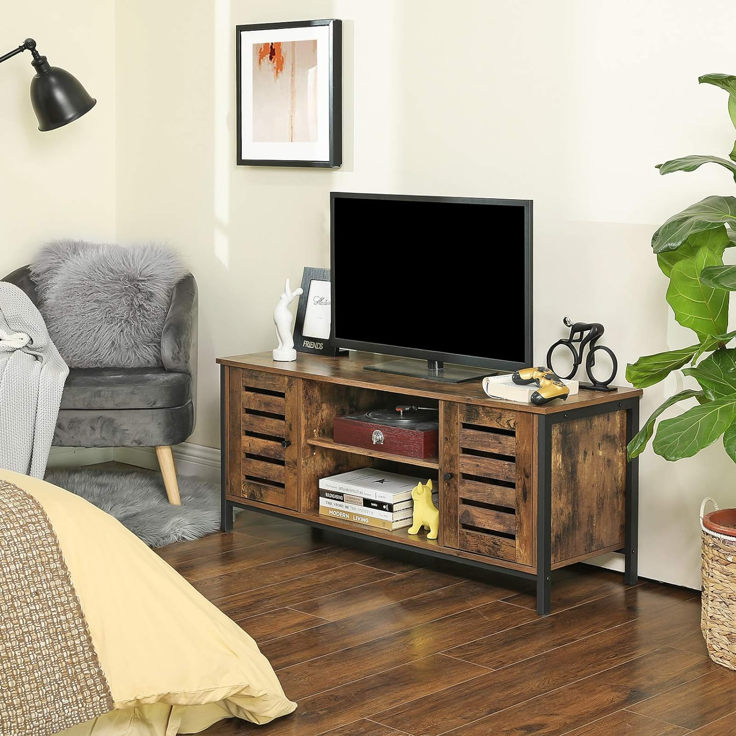 Specificatii: Culoare: Maro rustic (BX), Greige (MB) Material: PAL, metal Dimensiunea produsului: 110 x 40 x 50 cm Greutate produs: 43,6 lb (19,8 kg) Capacitatea de incarcare statica a suprafetei superioare: 110 lb (50 kg) Capacitatea de incarcare statica a raftului din mijloc: 33 lb (15 kg) Unele obiecte sunt mai mari decat altele, si intelegem asta - de aceea aceasta consola pentru televizor se mandreste cu un raft reglabil cu 3 optiuni de inaltime in mijloc, ceea ce iti permite sa potrivesti mai usor obiectele mai inalte acolo unde ai nevoie de ele.Cu un suport reglabil sub fiecare picior metalic al acestui dulap TV stabil, televizorul, consolele de jocuri si colectia de filme vor ramane toate la locul lor chiar si pe podele usor denivelate.Cu un amestec de metal durabil si lemn dens, acest dulap TV spatios cu depozitare ofera televizorului dvs. o casa pentru anii urmatori. Ofera o senzatie industriala, rustica oricarei case.Asamblati cu usurinta: cu instructiuni usor de urmat, puteti avea acest dulap TV cu depozitare montat inainte ca serialul dvs. preferat sa inceapa.