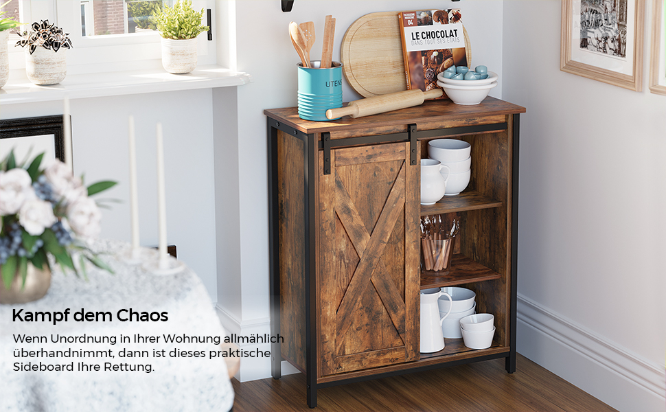 Specificatii: Culoare: maro rustic, negru Material: Placi aglomerate, otel Dimensiunea produsului: 70 x 30 x 80 cm Greutatea produsului: 19,3 kg Capacitate de incarcare statica a blatului: 30 kg Capacitate de incarcare statica a fiecarui raft: 10 kg Despre acest articol Acest dulap lateral maro de epoca cu cadru din otel negru emana un sentiment de stil si eleganta.Datorita instructiunilor usor de inteles, a pieselor numerotate si a surubelnitei incluse, montarea acestui dulap este foarte simpla.Cele doua rafturi din interiorul dulapului de bucatarie sunt, de asemenea, reglabile in inaltime: sus, jos, reglati-le dupa cum aveti nevoie.Veti primi: Un dulap lateral flexibil cu usa glisanta care se va potrivi atat in camera de zi si dormitor, cat si in bucatarie, precum si in biroul dvs. de acasa.Stabilitatea dulapului nu este asigurata doar de cadrul solid din otel, ci si de picioarele reglabile care compenseaza denivelarile din sol.