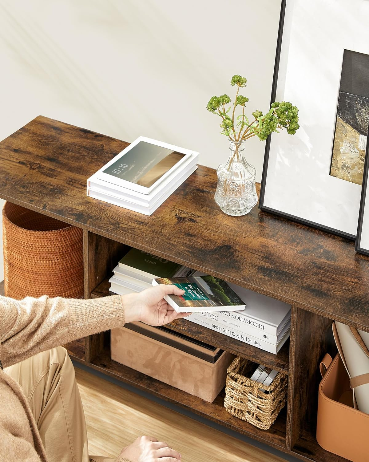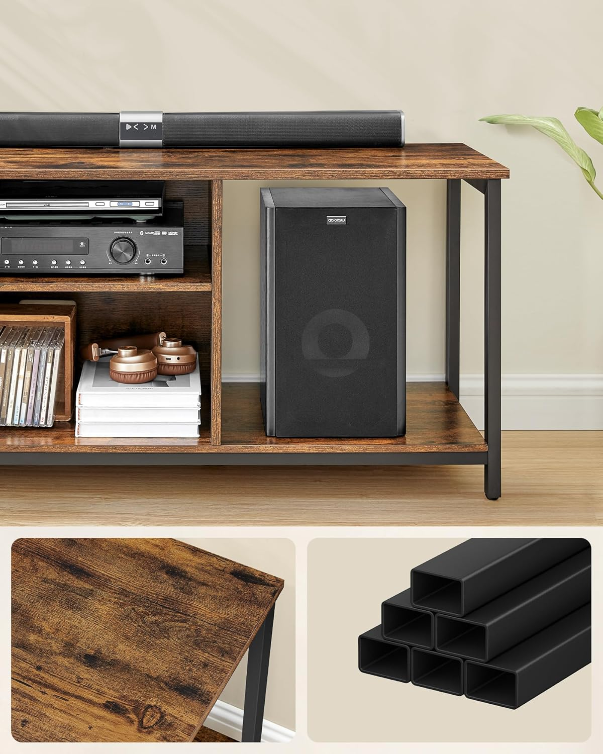 Specificatii tehnice Brand: VASAGLE Tip produs: Comoda TV Material: PAL si cadru metalic Culoare: Maro rustic + negru cerneala Dimensiuni produs: 147 x 40 x 50 cm (L x l x H) Forma: Dreptunghiulara Capacitate maxima suportata: 95 kg Compatibilitate TV: Pana la 65 inch Stil: Industrial Montaj: Necesita asamblare (include instructiuni clare) Utilizare recomandata: Living, camera de zi, zona de entertainment Scurta descriere Comoda TV VASAGLE combina stilul industrial cu functionalitatea moderna. Cu o lungime de 147 cm si rafturi multiple, este ideala pentru televizor, consola, boxe si decor. Stabilitatea este asigurata de cadrul metalic robust si picioarele ajustabile. Caracteristici principale Design industrial cu finisaj maro rustic si cadru negru Blat incapator pentru TV de pana la 65 inch 2 rafturi centrale si 2 laterale pentru organizare Constructie solida din PAL si otel Capacitate de incarcare de pana la 95 kg Picioare reglabile pentru stabilitate optima Montaj simplu cu instructiuni incluse