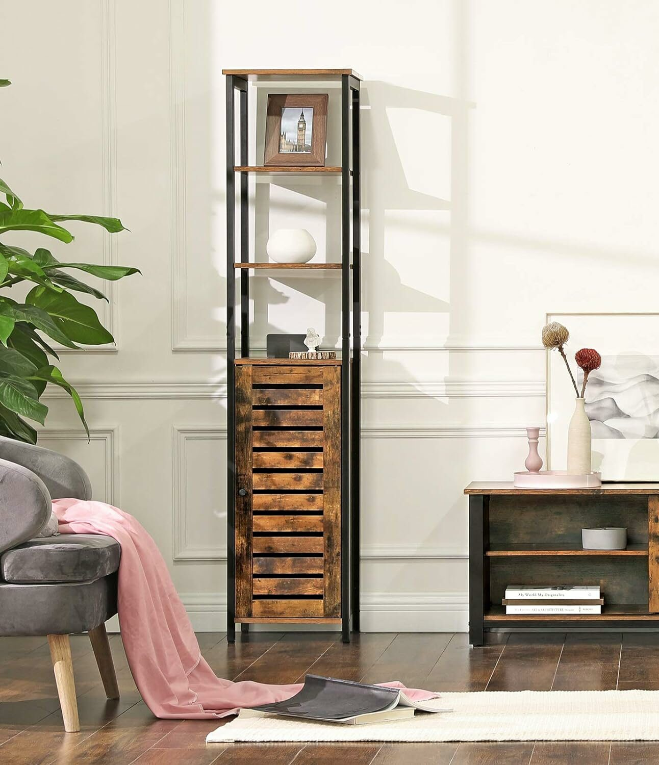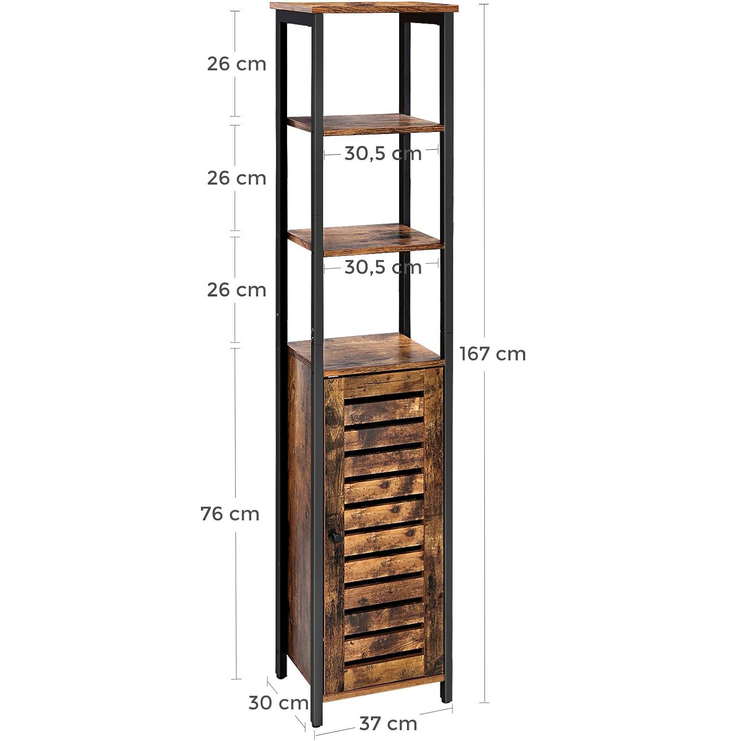 Caracteristici: Culoare: Maro rustic, negru. Materiale: PAL, Fier Dimensiuni: 37 x 30 x 167 cm (L x l x H). Greutate: 18,3 kg Capacitate de incarcare statica a placii superioare: 30 kg Capacitate de incarcare statica a raftului: 20 kg/nivel Capacitate de incarcare statica a dulapului: 15 kg/nivel Numar de rafturi din dulap: 2 (3 reglabile posturi) Despre acest articol Aceasta piesa in stil turn este prevazuta cu 3 rafturi deschise si 2 rafturi ascunse.Usa in stil oblon se deschide cu o usoara apasare. In interiorul dulapului, pozitia celor 2 rafturi este reglabila, exista suficient spatiu pentru a-ti depozita obiectele.Combinatia solida realizata din fier rezistent si material lemnos durabil confera acestui raft multifunctional un nivel ridicat de stabilitate. Incarcati zonele de depozitare de sus cu obiecte de pana la 20 kg.Folositi piesa de mobilier inalta de 167 cm nu doar pentru living, ci puneti-o si in dormitor, de exemplu, pentru a va mobila casa cu plante verzi si rame fato. Sau ce ziceti de un spatiu de depozitare in plus in bucatarie?