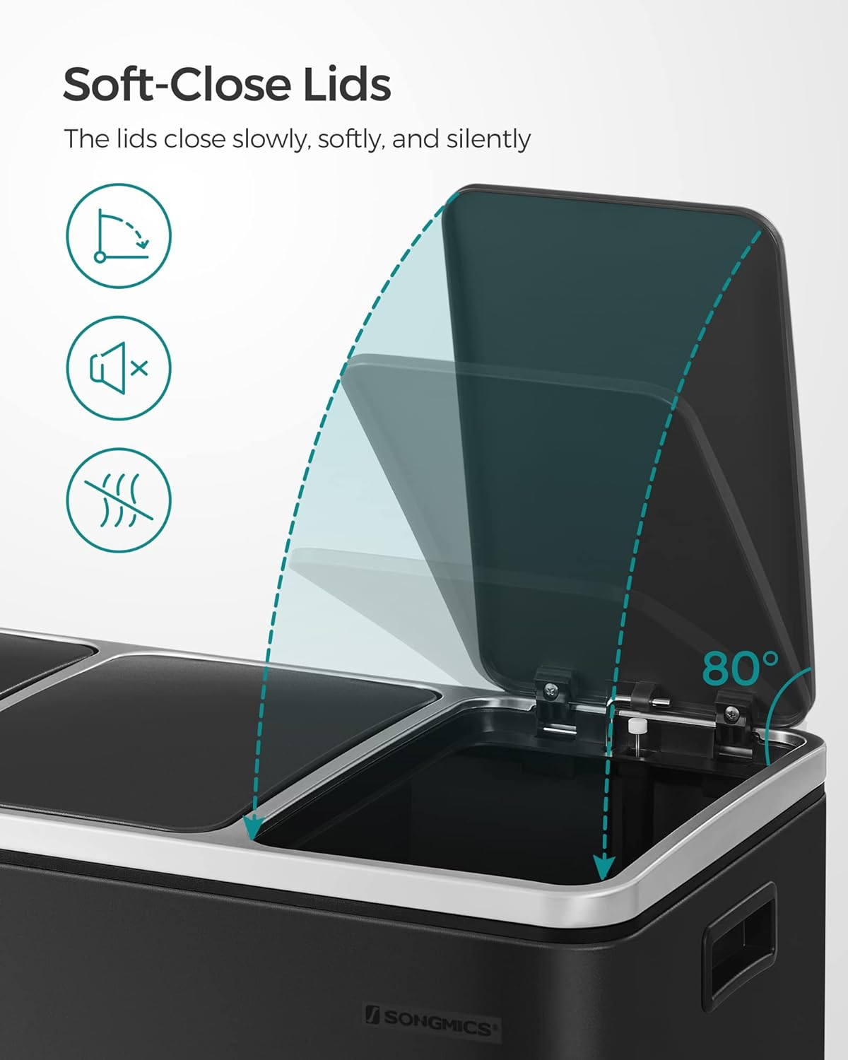Capacitate: 54 litri Culoare: Negru Mecanism de deschidere: Step-On Material: Otel, galeata din plastic PP, capac din plastic AB Despre acest articol Cu acest cos de gunoi cu trei compartimente de 18 litri, puteti depozita gunoiul, de exemplu, deseuri de ambalaje, deseuri organice si deseuri reziduale.Cosul de gunoi pentru bucatarie este fabricat din otel si este rezistent la rugina. Pur si simplu stergeti suprafata cosului de gunoi cu o carpa umeda.Capacele cosului se inchid incet, silentios si delicat pentru a preveni zgomotul neplacut.Linii clare, culoare neagra eleganta - Acest sistem de separare a deseurilor are un aspect modern si se potriveste perfect cu alte obiecte de mobilier si aparate de uz casnic.Usor de deschis si golit: Pur si simplu apasati pe pedala pentru a deschide capacul acestui cos de gunoi fara a atinge cosul cu mana. Galetile interioare pot fi ridicate si golite cu usurinta datorita manerului metalic.