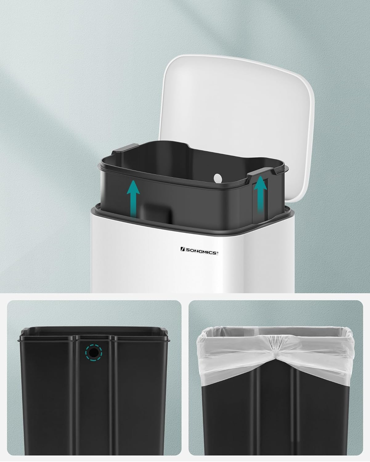 SONGMICS Cos de gunoi din otel cu pedala, 30litri, cu galeata interioara si capac, soft close, 34x61x32cm, alb