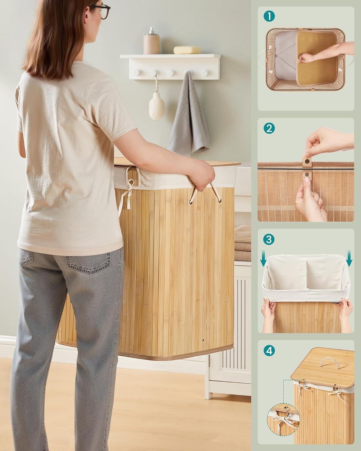 Cosul de rufe SONGMICS din bambus ofera o solutie practica si eleganta pentru organizarea rufelor. Capacitatea mare de 120 l si cele doua compartimente permit sortarea usoara a rufelor, iar capacul reduce mirosurile si protejeaza continutul de praf. Designul pliabil si sacul textil detasabil asigura utilizare confortabila si intretinere simpla.