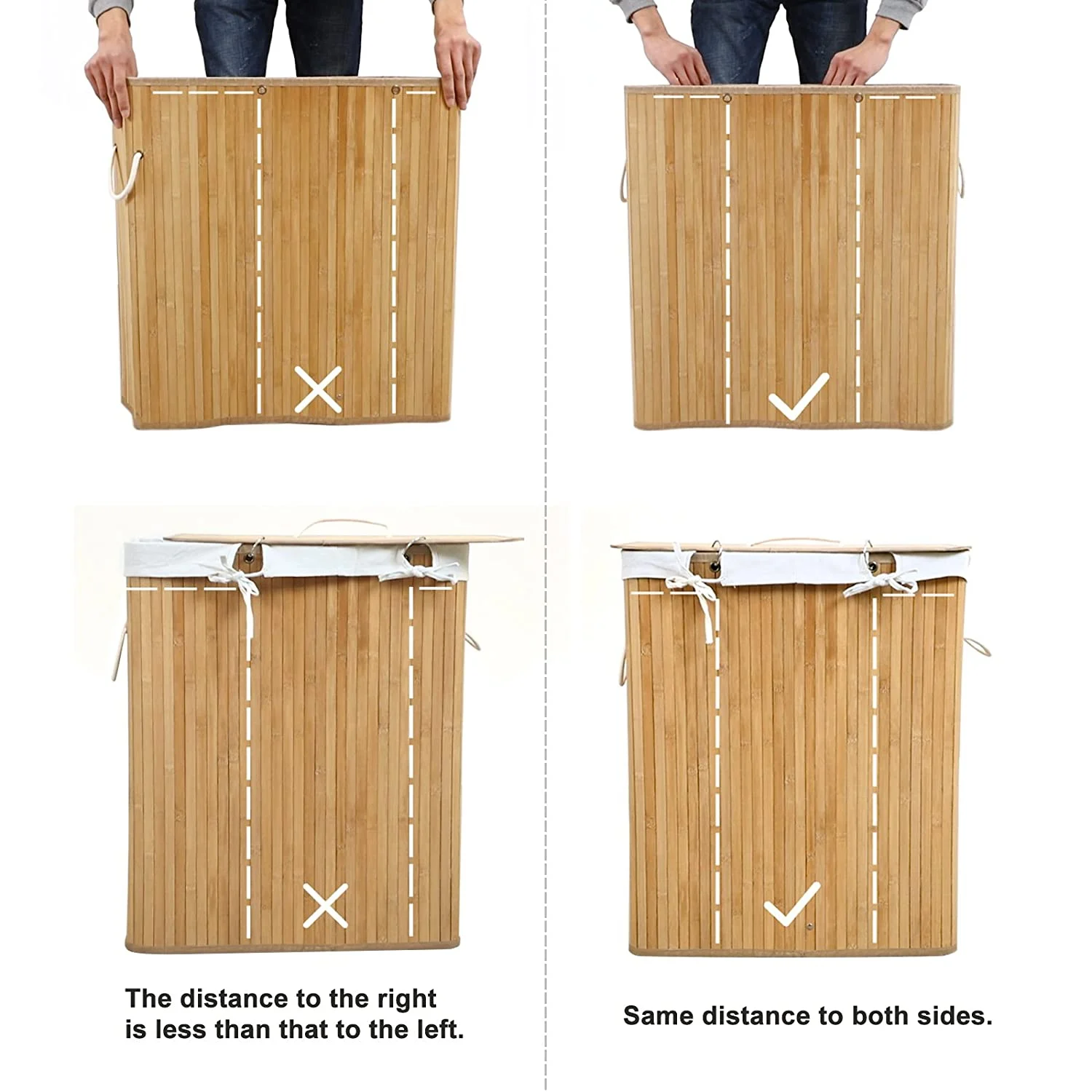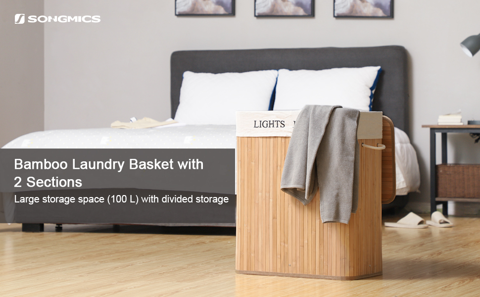 SONGMICS Cos de rufe din bambus cu capac, 2 compartimente, sac detasabil, volum 100L, 52x32x62cm, maro