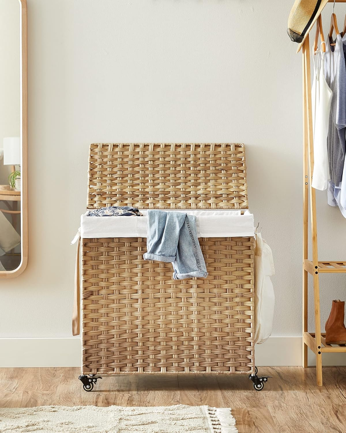 SONGMICS Cos de rufe tesut manual, cu captuseala detasabila lavabila, 3 compartimente, stil ratan, 140 litri, 66x33x60 cm, maro
