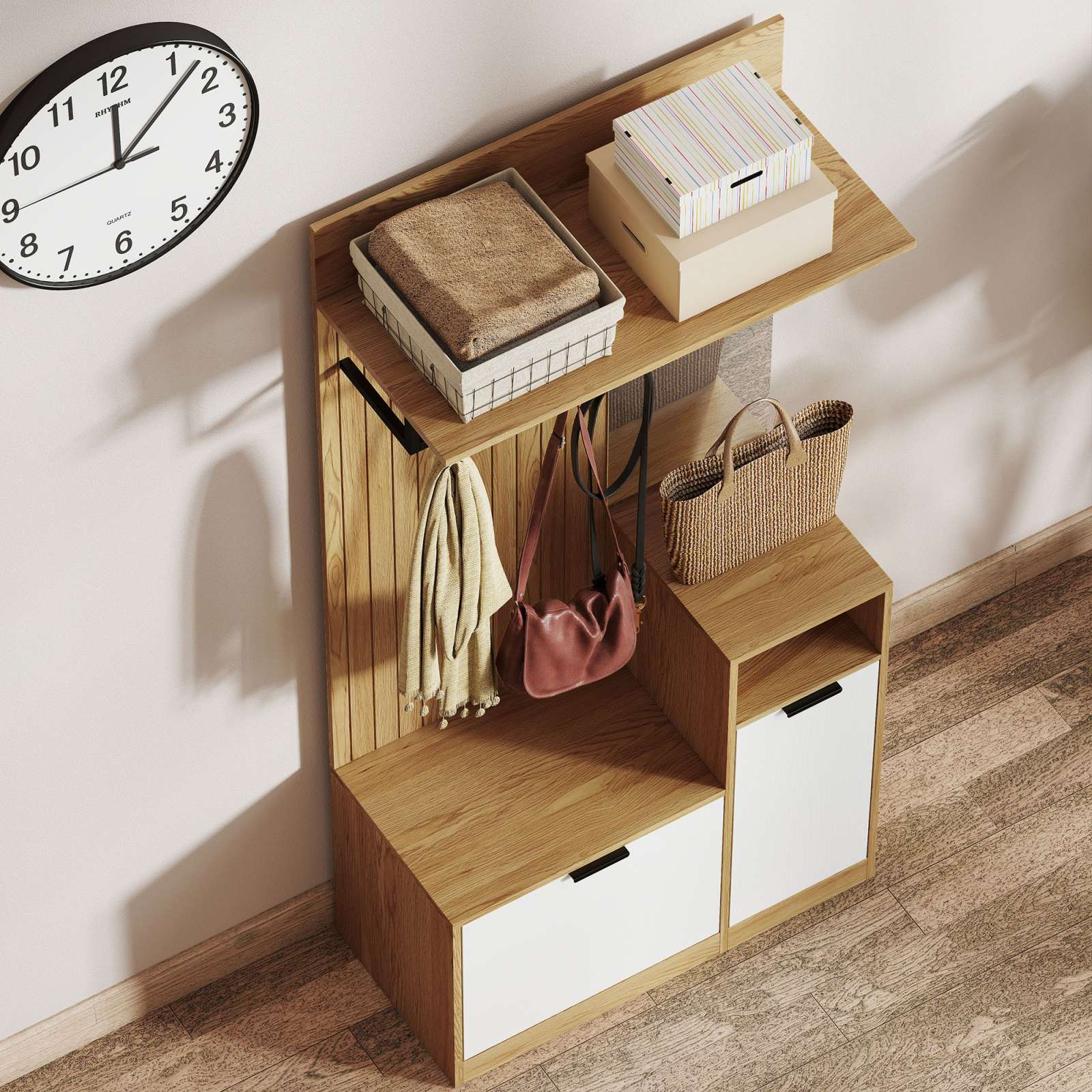 - OPtIUNI FLEXIBILE DE DEPOZITARE: Doua dulapuri cu deschidere rabatabila si un compartiment deschis ofera spatiu pentru incaltaminte si accesorii, mentinand holul ordonat si primitor in fiecare zi.
