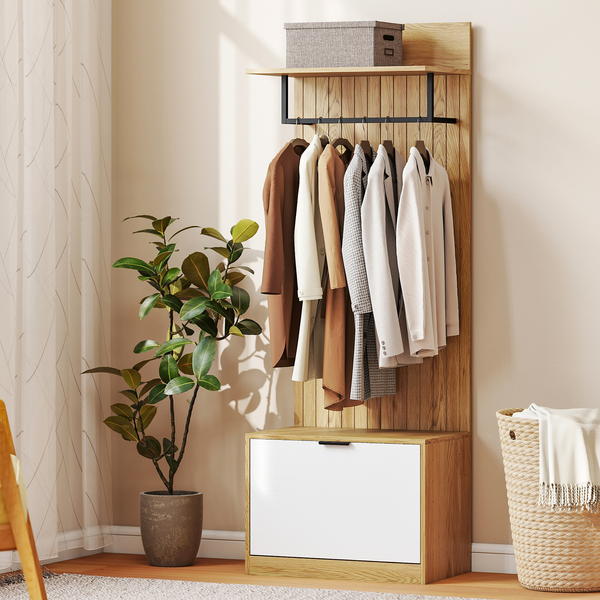 Cuier de Hol cu Pantofar Rabatabil, Cuier cu Banca, 4 Carlige si Rafturi pentru Pantofi, Organizator Modern pentru Hol si Coridor, Stejar si Alb