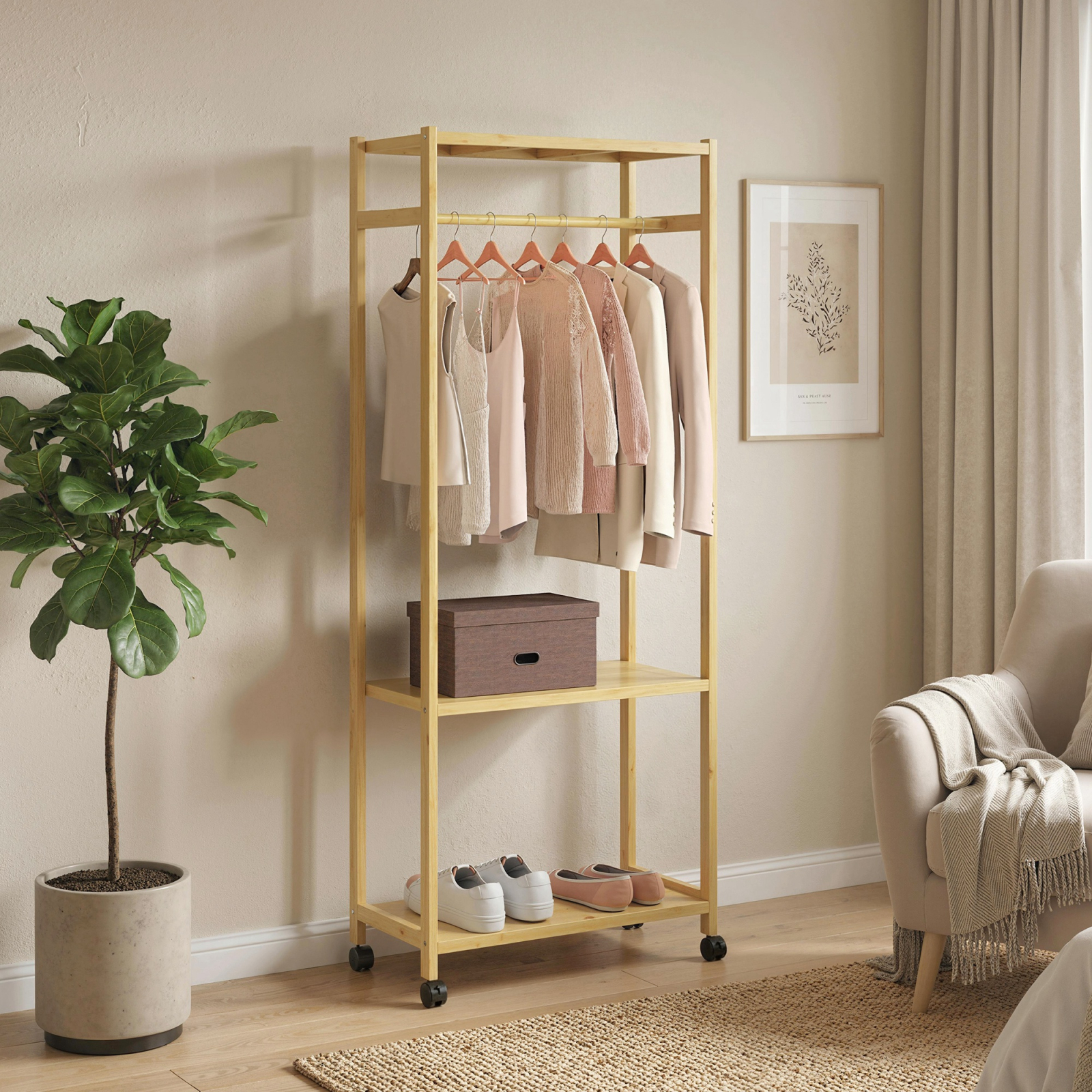 Haosul diminetilor cu haine aruncate prin casa poate face alegerea tinutei stresanta si poate lasa spatiile dezordonate. Cuierul din lemn de bambus [BRAND NAME], echipat cu o bara pentru haine, doua rafturi si roti blocabile, ofera organizare si confort, simplificand rutina zilnica.