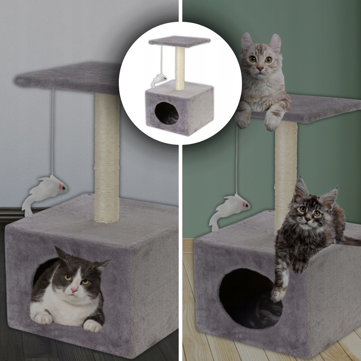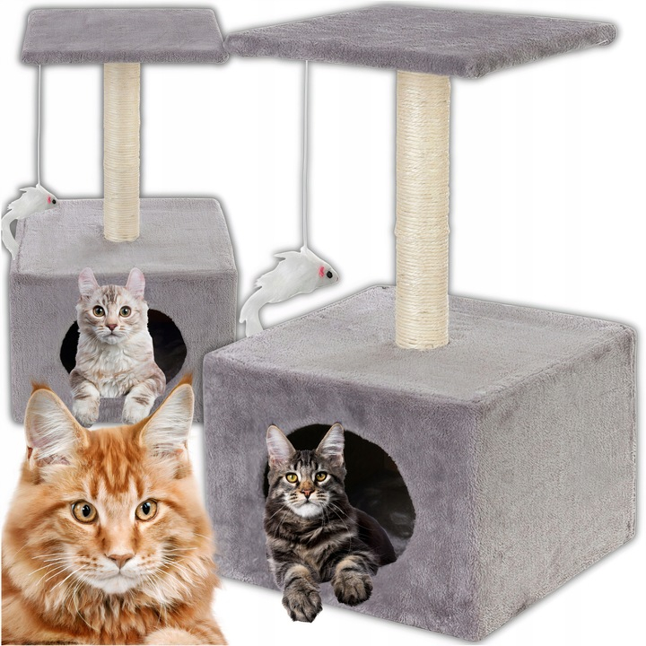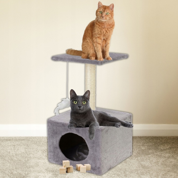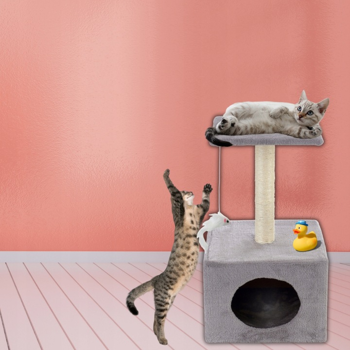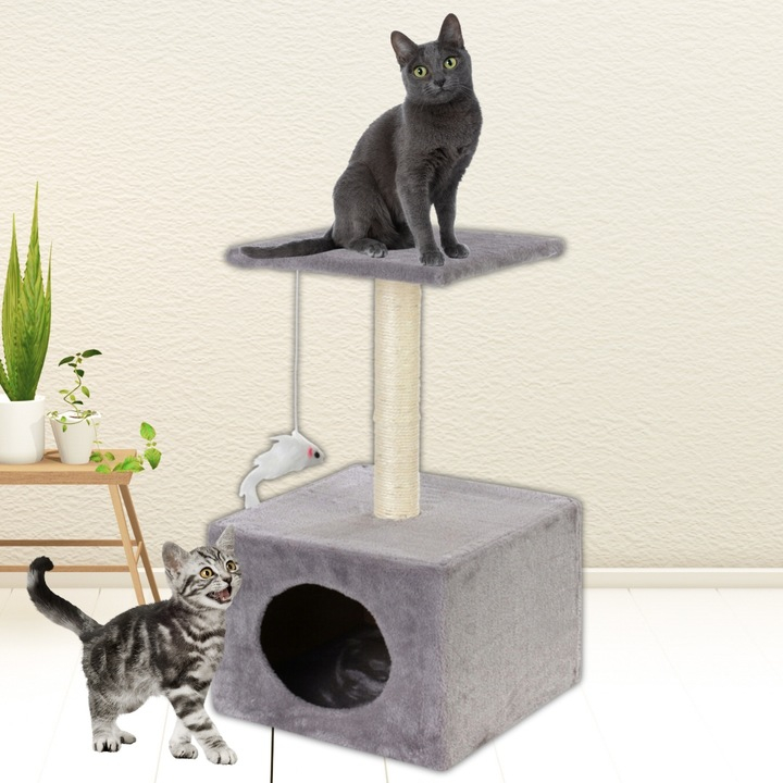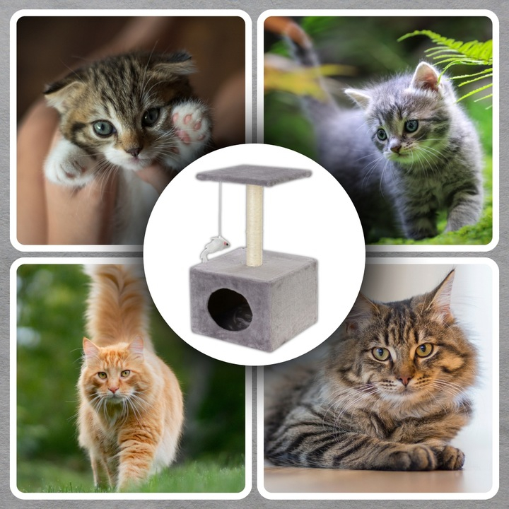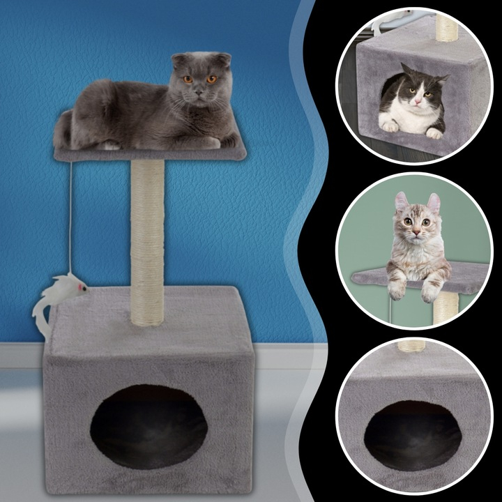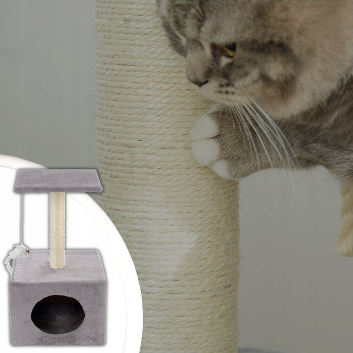 Inaltime totala: 59,0 cm Inaltimea casei: 30,0 cm Dimensiuni platforma: 30,0 cm x 30,0 cm Baza: 33,5 cm x 33,5 cm Diametrul intrarii in casa: 20,0 cm Diametrul stalpilor: 5,5 cm Inaltimea stalpului: 28,0 cm Grosime platforma: 1,5 cm Materiale: franghie sisal, plus moale, PAL Numarul de niveluri: 3 Vrei ca pisica ta sa se distreze la nesfarsit intr-un loc placut unde si relaxant? Aceasta este implinirea celor mai profunde vise atat ale proprietarilor, cat si ale animalelor lor de companie – un stalp de zgarieturi pe mai multe niveluri! Stabilitate: stalpul este proiectat pentru o stabilitate neclintita. Pisica ta poate sa se catere, sa sara si sa se zgarie fara griji. Design pe mai multe niveluri pentru joc optim: locul de joaca ofera nu doar unul, ci mai multe niveluri de explorat. Pisica ta poate urca pe varfuri si cobori in adancuri, descoperind noi perspective de joaca si relaxare. Placut la atingere: realizat dintr-un material exceptional de placut la atingere, stalpul de zgariere ofera labei pisicii sensibilitatea si confortul de care are nevoie. Durabilitate: realizat din material durabil, va rezista nu numai la zgarieturile de zi cu zi, ci si la multe luni de utilizare intensiva, asigurand durabilitate ani de zile. Distractie si bucurie: Cu o varietate de niveluri si locuri ascunse de explorat, pisica ta va gasi o multime de moduri de a petrece timp activ si distractiv. Materiale naturale, sigure pentru pisici: sfoara din jurul stalpilor este fabricata din sisal, o fibra tare si foarte durabila. Acesta este cu siguranta momentul potrivit pentru a oferi pisicii tale iubite un loc ideal de dezvoltare, joaca si odihna. Locul nostru de joaca nu este doar o piesa de mobilier, este o oaza de placere pentru animalul tau de companie. Nu mai astepta – ofera pisicii tale un cadou care ii va ridica calitatea vietii la un nivel complet nou!