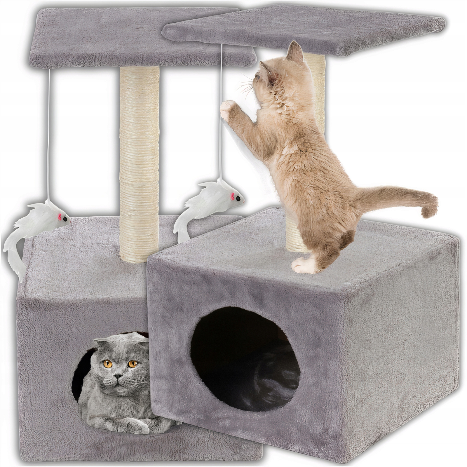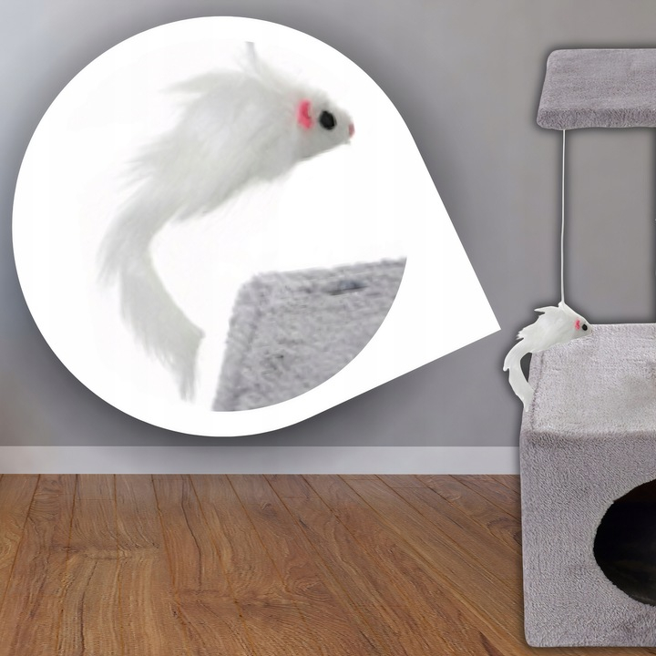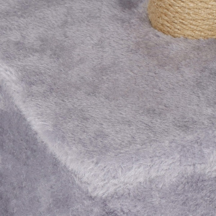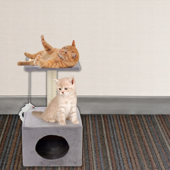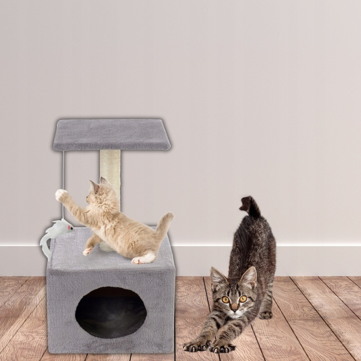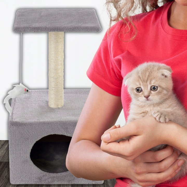 Inaltime totala: 59,0 cm Inaltimea casei: 30,0 cm Dimensiuni platforma: 30,0 cm x 30,0 cm Baza: 33,5 cm x 33,5 cm Diametrul intrarii in casa: 20,0 cm Diametrul stalpilor: 5,5 cm Inaltimea stalpului: 28,0 cm Grosime platforma: 1,5 cm Materiale: franghie sisal, plus moale, PAL Numarul de niveluri: 3 Vrei ca pisica ta sa se distreze la nesfarsit intr-un loc placut unde si relaxant? Aceasta este implinirea celor mai profunde vise atat ale proprietarilor, cat si ale animalelor lor de companie – un stalp de zgarieturi pe mai multe niveluri! Stabilitate: stalpul este proiectat pentru o stabilitate neclintita. Pisica ta poate sa se catere, sa sara si sa se zgarie fara griji. Design pe mai multe niveluri pentru joc optim: locul de joaca ofera nu doar unul, ci mai multe niveluri de explorat. Pisica ta poate urca pe varfuri si cobori in adancuri, descoperind noi perspective de joaca si relaxare. Placut la atingere: realizat dintr-un material exceptional de placut la atingere, stalpul de zgariere ofera labei pisicii sensibilitatea si confortul de care are nevoie. Durabilitate: realizat din material durabil, va rezista nu numai la zgarieturile de zi cu zi, ci si la multe luni de utilizare intensiva, asigurand durabilitate ani de zile. Distractie si bucurie: Cu o varietate de niveluri si locuri ascunse de explorat, pisica ta va gasi o multime de moduri de a petrece timp activ si distractiv. Materiale naturale, sigure pentru pisici: sfoara din jurul stalpilor este fabricata din sisal, o fibra tare si foarte durabila. Acesta este cu siguranta momentul potrivit pentru a oferi pisicii tale iubite un loc ideal de dezvoltare, joaca si odihna. Locul nostru de joaca nu este doar o piesa de mobilier, este o oaza de placere pentru animalul tau de companie. Nu mai astepta – ofera pisicii tale un cadou care ii va ridica calitatea vietii la un nivel complet nou!