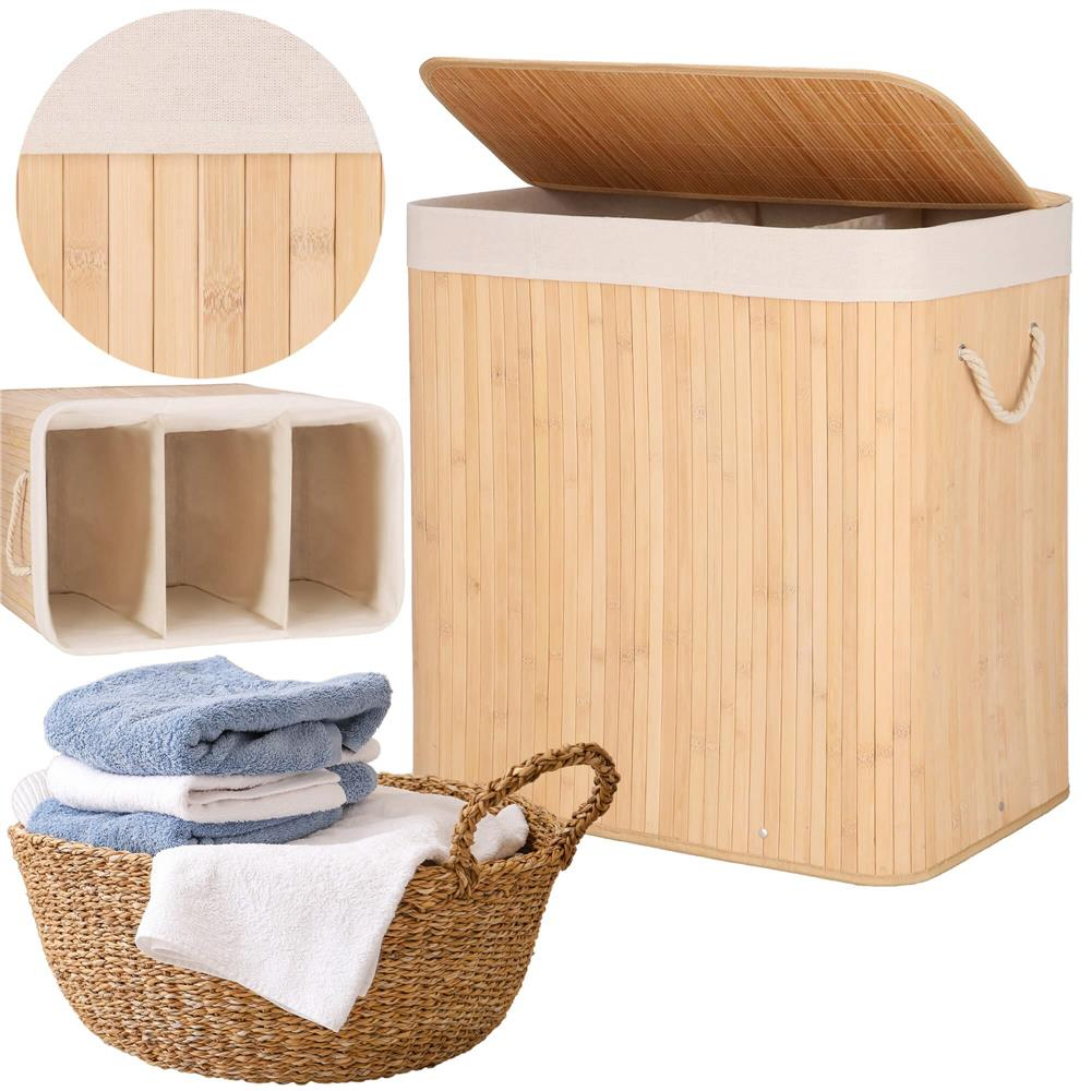 Culoare: maro deschis / ecru Material: bambus, MDF, tesatura, metal Capacitate: 150 L Numar de compartimente: 3 Produs care se asambleaza singur - instructiuni pe spatele etichetei Dimensiuni: Inaltime: 63 cm, latime: 62 cm, adancime: 42 cm Cosul de rufe din bambus este o optiune excelenta pentru a completa o baie moderna. Nu numai ca produsul arata extrem de frumos, dar este, de asemenea, un accesoriu practic si functional pentru interior. Sac interior detasabil. Interior impartit in trei compartimente. Capacitate mare. Manere confortabile. Material prietenos cu mediul inconjurator. Design extrem de la moda. In interiorul cosului veti gasi o punga detasabila din amestec de poliester si bumbac de culoare deschisa, care poate fi scoasa liber si improspatata prin spalare. Clapeta cu incuietoare permite ascunderea continutului, adica a hainelor care urmeaza sa fie spalate. Cosul este prevazut cu manere cu cordon pe laterale pentru o transportare usoara. Cosul este fabricat din bambus natural de inalta calitate, care este ecologic si, mai presus de toate, usor. Are o capacitate de pana la 150 de litri, astfel incat poate gazdui un numar mare de obiecte.