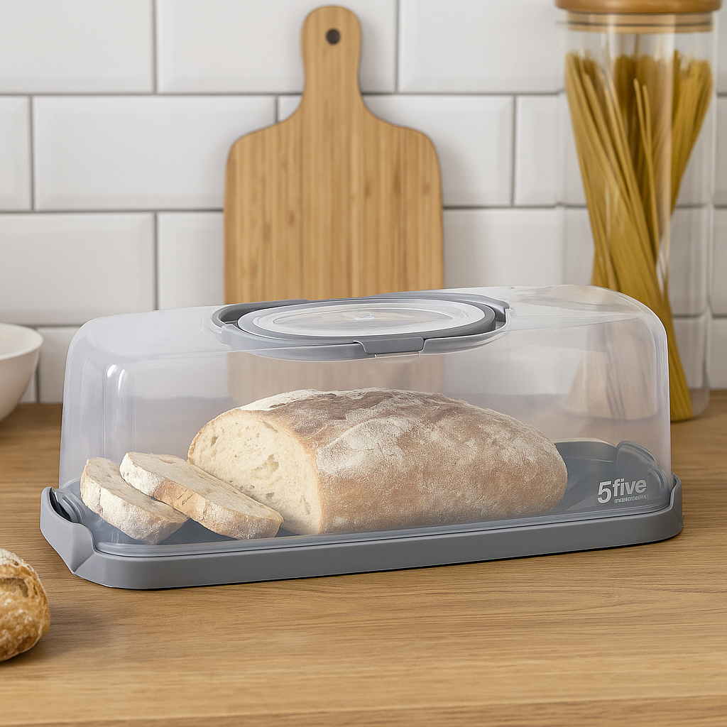 Specificatii tehnice Culoare: Gri Material: Polipropilena (PP) Dimensiuni produs: L. 36 x P. 13.3 x H. 16 cm Contact alimentar: da Compatibilitate masina de spalat vase: nu Compatibilitate cuptor cu microunde: nu Compatibilitate cuptor: nu Scurta descriere Cutie din polipropilena destinata depozitarii painii sau produselor de patiserie. Designul modern si culoarea gri neutra o fac potrivita pentru orice bucatarie. Asigura o depozitare igienica, protejand continutul de umezeala si factori externi. Caracteristici principale Material sigur pentru contact alimentar Forma compacta si practica Pastreaza painea proaspata mai mult timp Design modern in nuante neutre Usor de curatat manual