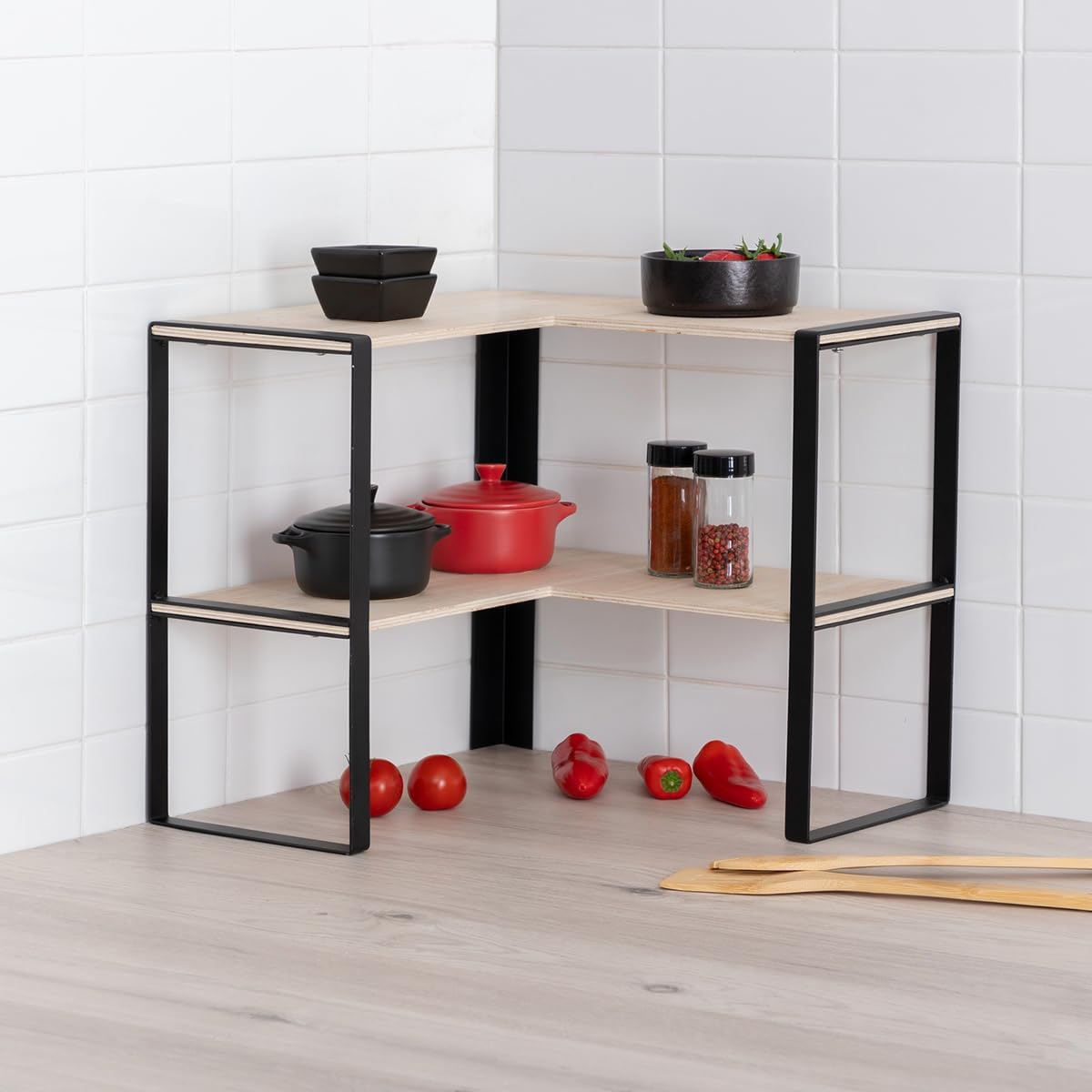 Specificatii tehnice    Model:  Blackwood  Culoare:  Bej  Material:  Placaj si otel  Dimensiuni produs:  L. 40 x P. 40 x H. 35 cm  Greutate produs:  2.26 kg  Montaj:  Necesita asamblare   Scurta descriere   Etajera Blackwood cu 2 niveluri este conceputa pentru a se potrivi perfect in colturi, oferind un plus de spatiu de depozitare fara a incarca vizual incaperea. Combinatia dintre otelul rezistent si placajul in ton bej creeaza un design modern si functional.   Caracteristici principale    	 Design optimizat pentru colturi  	 2 niveluri pentru depozitare compacta  	 Structura robusta din otel  	 Placaj durabil, finisaj natural  	 Usor de integrat in bai, bucatarii sau birouri  	 Asamblare rapida