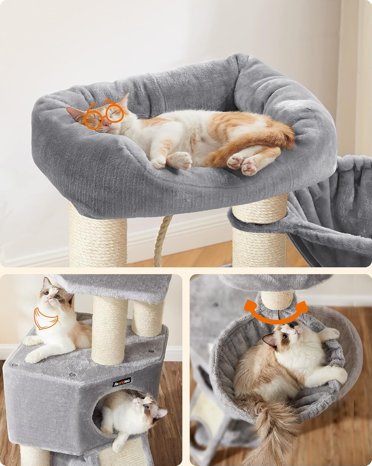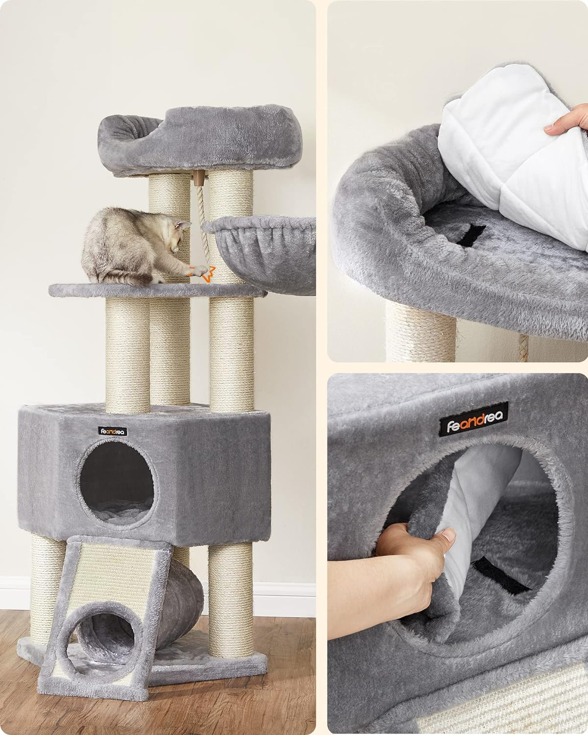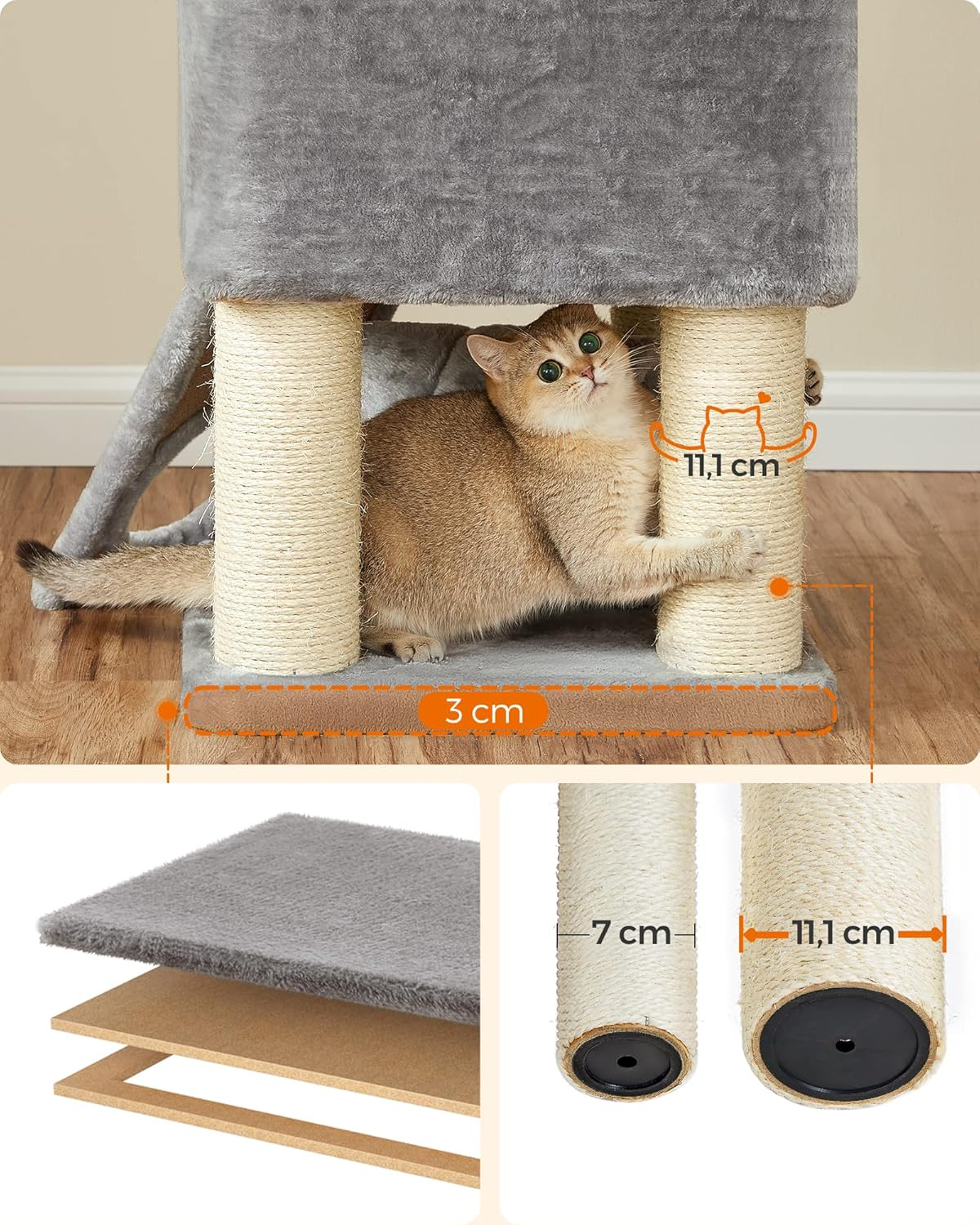 In atelierul creativ FEANDREA, 2 pisicute adorabile alearga aici, controleaza calitatea arborilor pentru pisici si ne permit sa judecam calitatea pentru a va oferi cel mai bun produs posibil. In acest fel, inginerii echipei de cercetare si dezvoltare FEANDREA colecteaza informatii de prima mana si incearca sa indeplineasca cerintele prietenilor nostri felini. De ce sa alegeti acest copac pentru pisici FEANDREA? O multime de spatiu: Dimensiunea totala este de 50 x 50 x 141 cm, cu o platforma mare, un hamac larg si o nisa spatioasa Baza de 50 x 50 cm, stalpii grosi cu diametrul de 11,5 cm, materialele de calitate si kitul anti-basculare inclus asigura o stabilitate perfecta. Potrivit pentru pisoi si pisici in varsta: Nivelurile si tabla de zgariat le faciliteaza urcarea si coborarea. Moale si confortabila: Acoperit cu tesatura de plus pentru mai mult confort. O varietate de placeri: 1 platforma, 1 hamac, 1 nisa, 1 franghie de agatat din sisal, 1 tunel, mai multe posturi din sisal si 1 post de zgariat. Usor de asamblat: Cu piese numerotate, instructiuni ilustrate si un instrument de asamblare, acesta poate fi asamblat rapid si usor de catre o singura persoana Caracteristici: Culoare: Gri deschis, culoare lemnoasaMaterial: Placi aglomerate, tesatura plusata, sisalDimensiuni: 50 x 50 x 141 cm (L x l x i)Greutate: 22,3 kgCapacitate de incarcare statica maxima totala: 83 kgNumar recomandat de pisici: ≤ 5 (greutatea fiecarei pisici ≤ 10 kg). FEANDREA Precautii: Va rugam sa plasati acest arbore pentru pisici pe o suprafata plana si impotriva peretelui. Din motive de siguranta, este foarte recomandabil sa il fixati pe perete cu dispozitivul anti-basculare inclus. Va rugam sa nu utilizati acest arbore pentru pisici intr-un mediu umed. Este interzis copiilor sa se urce pe produs si sa se joace cu el. Spatiu XXL Acest copac pentru pisici este echipat cu o platforma mare de 50 x 50 cm, o cusca mare de 50 x 50 x 30 cm si un hamac XXL de 40 cm. Este potrivit in special pentru pisici mari Robust si stabil Cu o baza mare de 50 x 50 cm, stalpi grosi cu un diametru de 11,5 cm si bare de armare, acest turn de joaca este stabil chiar si atunci cand pisicile dvs. topaie. Kitul de inclinare il fixeaza la perete pentru si mai multa siguranta Pentru maxim 5 pisici Acest mobilier pentru pisici suporta pana la 83 kg in total. Cu mai multe niveluri, pisicile dvs. pot servi casa pe platforma, pot trage un pui de somn in hamac sau pot zgaria pe stalpii din sisal si pe stalpul de zgariat Usor de curatat si asamblat Capacul platformei de observatie este detasabil si lavabil. Toate suruburile sunt identice, chiar nu este nevoie sa le diferentiati. Asamblarea se face de catre o singura persoana folosind cheia Allen furnizata Loc de joaca, distractie fara sfarsit Cu placa de zgariat cu o gaura, franghie sisal agatata, hamac si platforma, acest copac pentru pisici ofera distractie fara sfarsit pentru prietenii dvs. felini