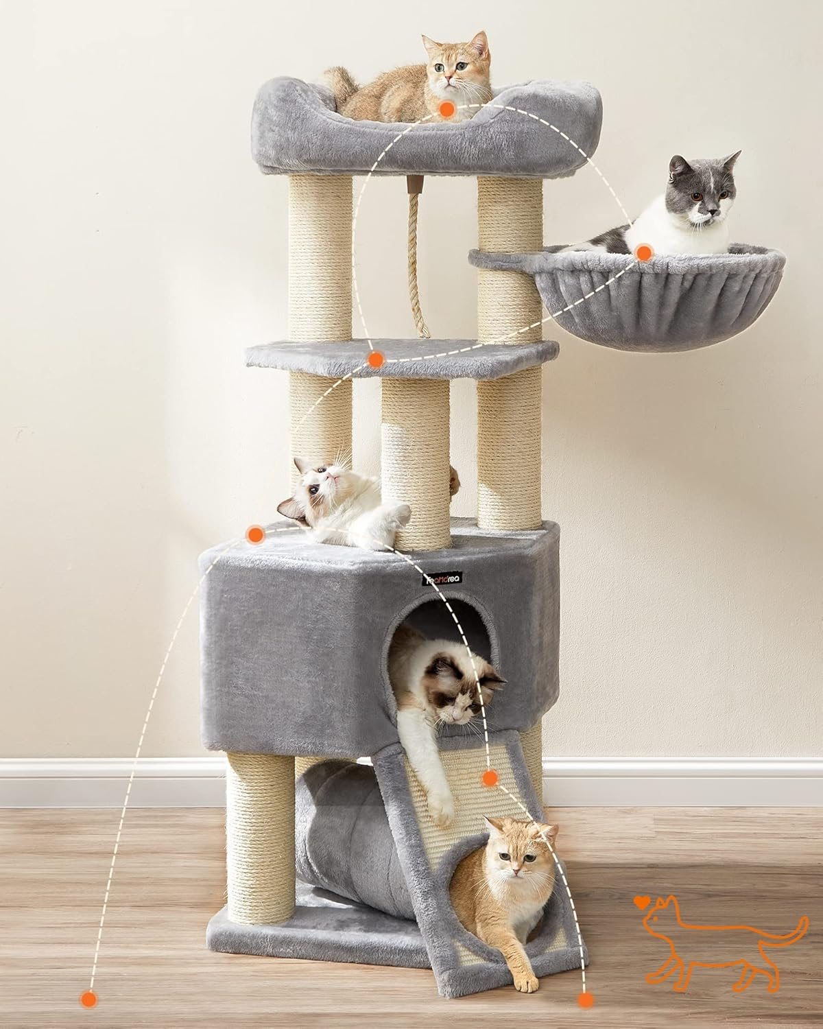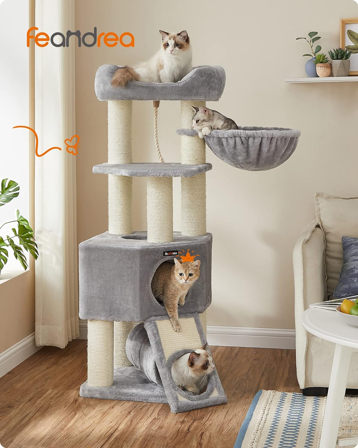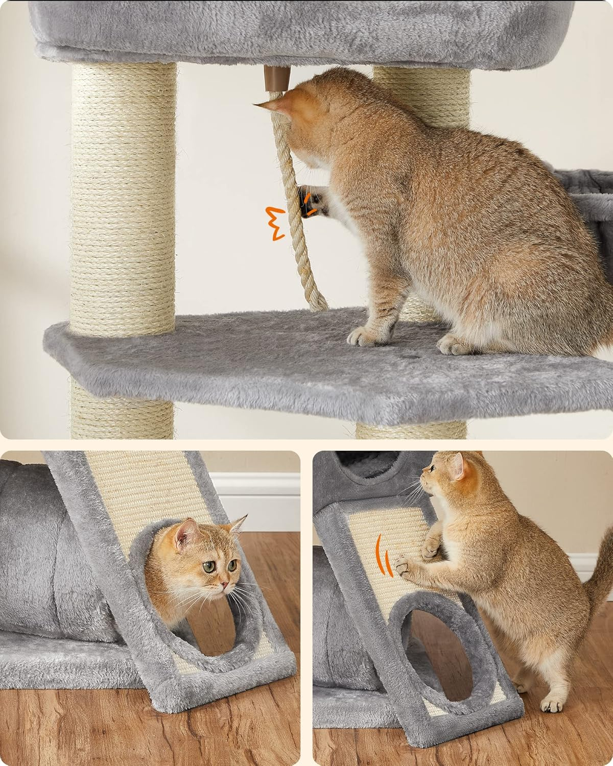 In atelierul creativ FEANDREA, 2 pisicute adorabile alearga aici, controleaza calitatea arborilor pentru pisici si ne permit sa judecam calitatea pentru a va oferi cel mai bun produs posibil. In acest fel, inginerii echipei de cercetare si dezvoltare FEANDREA colecteaza informatii de prima mana si incearca sa indeplineasca cerintele prietenilor nostri felini. De ce sa alegeti acest copac pentru pisici FEANDREA? O multime de spatiu: Dimensiunea totala este de 50 x 50 x 141 cm, cu o platforma mare, un hamac larg si o nisa spatioasa Baza de 50 x 50 cm, stalpii grosi cu diametrul de 11,5 cm, materialele de calitate si kitul anti-basculare inclus asigura o stabilitate perfecta. Potrivit pentru pisoi si pisici in varsta: Nivelurile si tabla de zgariat le faciliteaza urcarea si coborarea. Moale si confortabila: Acoperit cu tesatura de plus pentru mai mult confort. O varietate de placeri: 1 platforma, 1 hamac, 1 nisa, 1 franghie de agatat din sisal, 1 tunel, mai multe posturi din sisal si 1 post de zgariat. Usor de asamblat: Cu piese numerotate, instructiuni ilustrate si un instrument de asamblare, acesta poate fi asamblat rapid si usor de catre o singura persoana Caracteristici: Culoare: Gri deschis, culoare lemnoasaMaterial: Placi aglomerate, tesatura plusata, sisalDimensiuni: 50 x 50 x 141 cm (L x l x i)Greutate: 22,3 kgCapacitate de incarcare statica maxima totala: 83 kgNumar recomandat de pisici: ≤ 5 (greutatea fiecarei pisici ≤ 10 kg). FEANDREA Precautii: Va rugam sa plasati acest arbore pentru pisici pe o suprafata plana si impotriva peretelui. Din motive de siguranta, este foarte recomandabil sa il fixati pe perete cu dispozitivul anti-basculare inclus. Va rugam sa nu utilizati acest arbore pentru pisici intr-un mediu umed. Este interzis copiilor sa se urce pe produs si sa se joace cu el. Spatiu XXL Acest copac pentru pisici este echipat cu o platforma mare de 50 x 50 cm, o cusca mare de 50 x 50 x 30 cm si un hamac XXL de 40 cm. Este potrivit in special pentru pisici mari Robust si stabil Cu o baza mare de 50 x 50 cm, stalpi grosi cu un diametru de 11,5 cm si bare de armare, acest turn de joaca este stabil chiar si atunci cand pisicile dvs. topaie. Kitul de inclinare il fixeaza la perete pentru si mai multa siguranta Pentru maxim 5 pisici Acest mobilier pentru pisici suporta pana la 83 kg in total. Cu mai multe niveluri, pisicile dvs. pot servi casa pe platforma, pot trage un pui de somn in hamac sau pot zgaria pe stalpii din sisal si pe stalpul de zgariat Usor de curatat si asamblat Capacul platformei de observatie este detasabil si lavabil. Toate suruburile sunt identice, chiar nu este nevoie sa le diferentiati. Asamblarea se face de catre o singura persoana folosind cheia Allen furnizata Loc de joaca, distractie fara sfarsit Cu placa de zgariat cu o gaura, franghie sisal agatata, hamac si platforma, acest copac pentru pisici ofera distractie fara sfarsit pentru prietenii dvs. felini