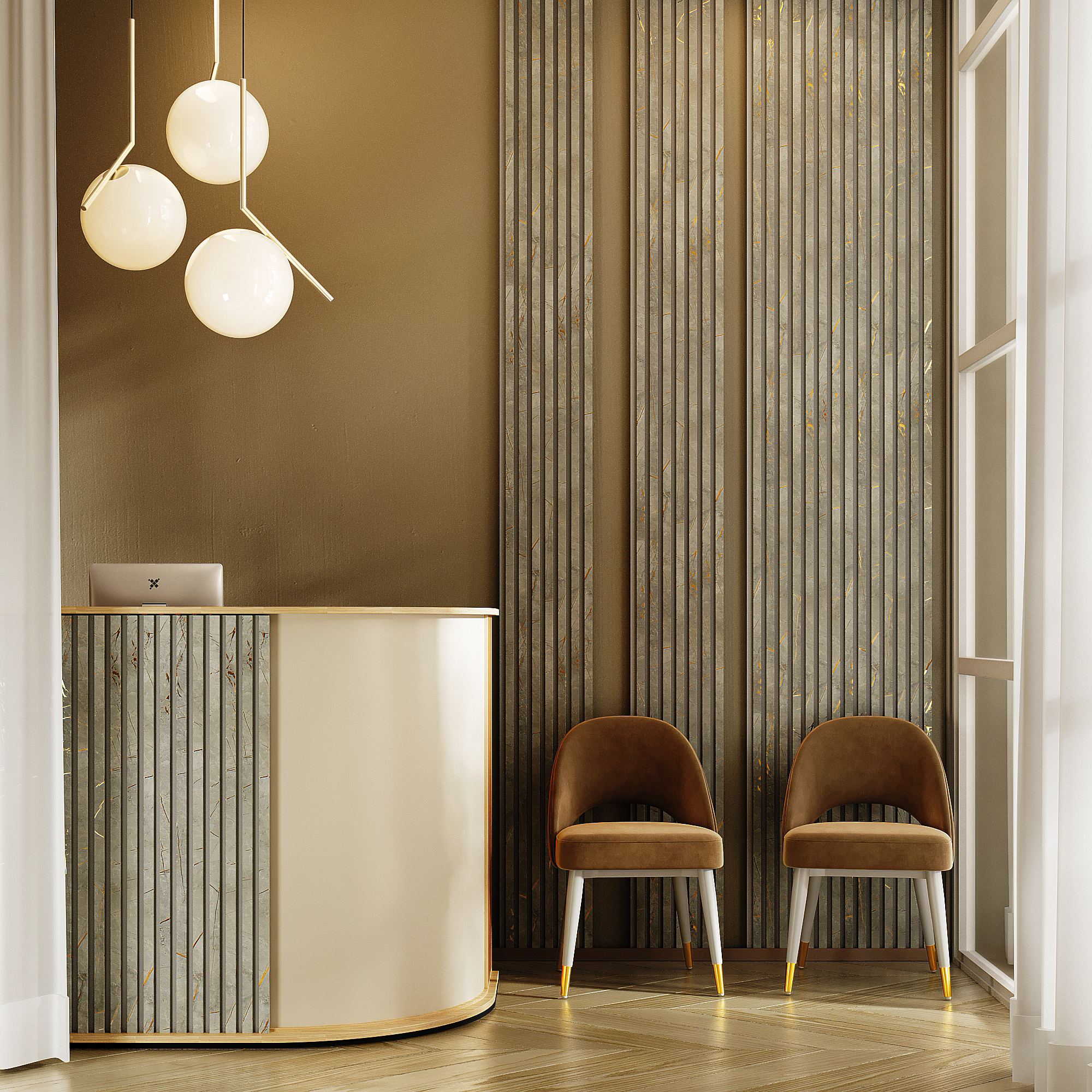 Adauga eleganta si functionalitate spatiului tau cu un panou decorativ acustic tip riflaj, realizat din MDF premium si montat pe un suport PET netesut reciclat. Cu un finisaj sofisticat si un design modern, acest panou este ideal pentru perete sau tavan, in locuinte, birouri sau spatii comerciale. Structura sa acustica ajuta la reducerea zgomotului ambiental, oferind in acelasi timp un aspect vizual rafinat. Se instaleaza usor (multiple variante de fixare: adeziv, holsuruburi, etc) si permite acoperirea suprafetelor fara imbinari vizibile, asigurand un rezultat continuu si uniform. Este o alegere excelenta pentru cei care doresc sa imbina designul contemporan cu un produs sustenabil, realizat in Uniunea Europeana din materiale reciclabile. Specificatii generale Tip produs: Panou decorativ acustic Material lamele: MDF E1 Material suport: Feltru PET reciclat Finisaj: Marmura cu insertii aurii (folie continua pe margini) Culoare suport: Negru Dimensiuni: 260 x 40 x 2 cm (L x l x grosime) Montaj: Pe perete sau tavan Utilizare: Interior (locuinte birouri comerciale studiouri) Caracteristici principale Design modern ideal pentru amenajari elegante sau minimaliste Fonoabsorbant reduce zgomotul ambiental si reverberatiile Instalare rapida fara imbinari vizibile intre panouri Produs non-toxic realizat din materiale certificate EU Fabricat integral in Uniunea Europeana Potrivit pentru dormitor living hol birou sau bucatarie Materiale ecologice cu impact redus asupra mediului Transport si ultilizare: ambalarea si livrarea poate fi facuta in cutii de carton care pot contine pana la 3 bucati, indiferent daca achizitia este facuta la nivel de bucata sau set; Produsul este destinat strict pentru interiorul locuintelor (nu exterior) si acesta nu trebuie montat in zone cu umiditate mare (gen: bai)