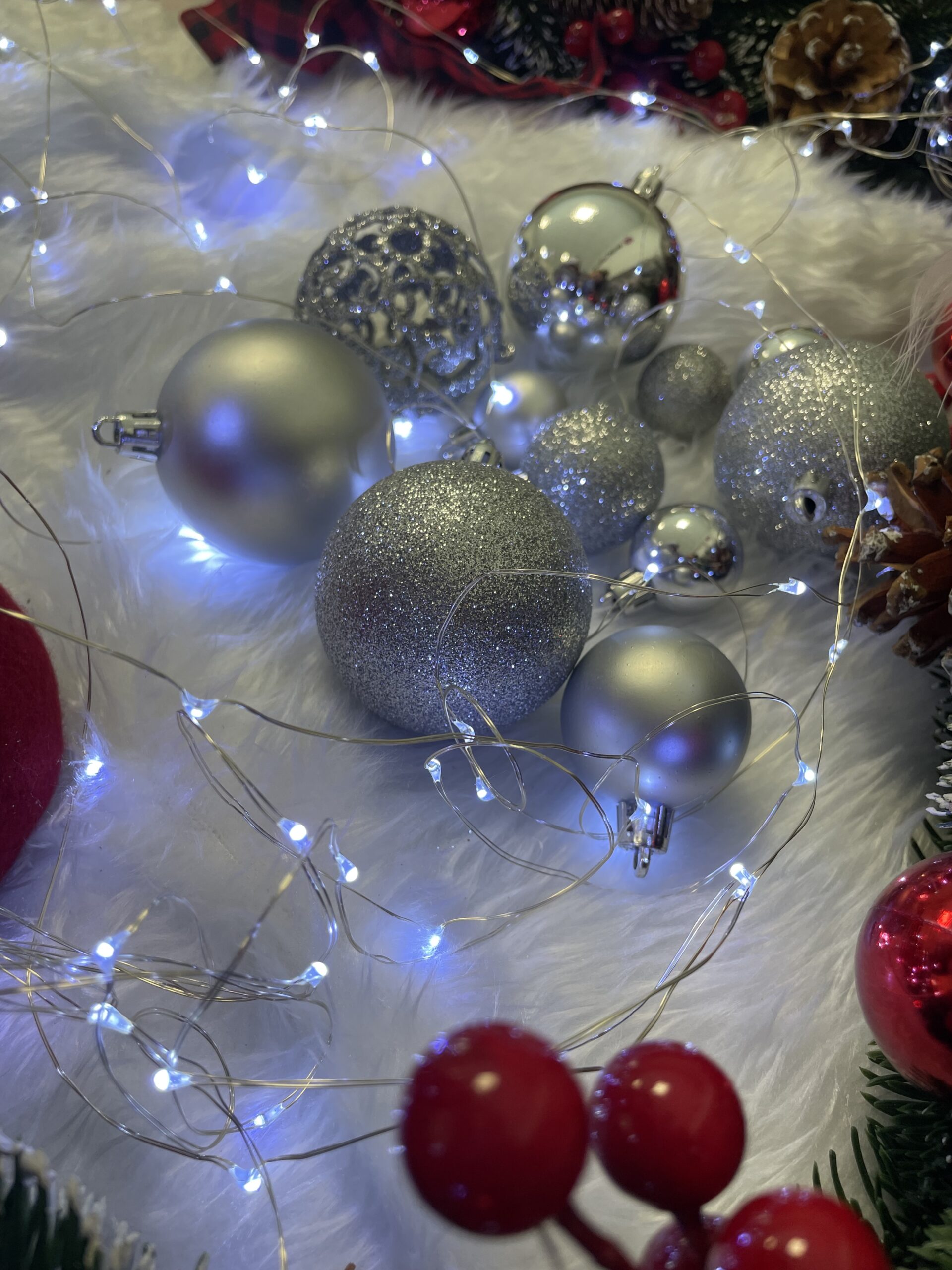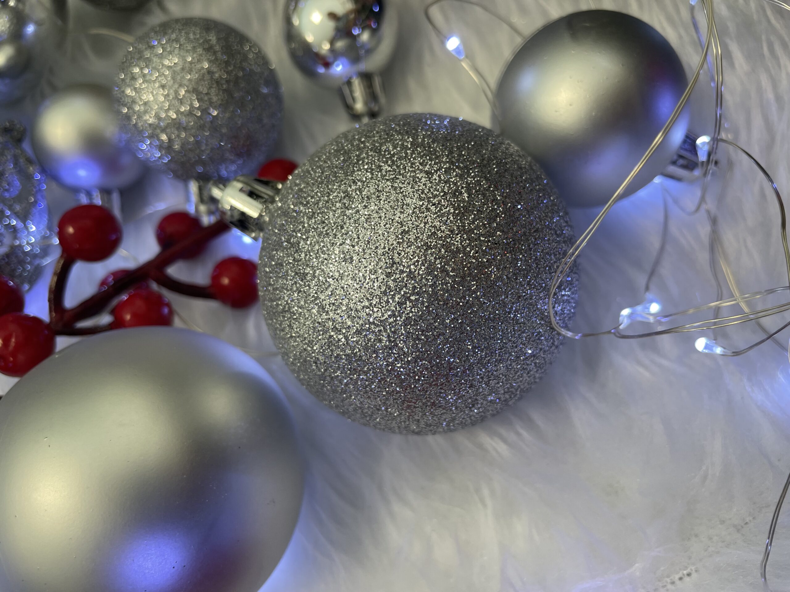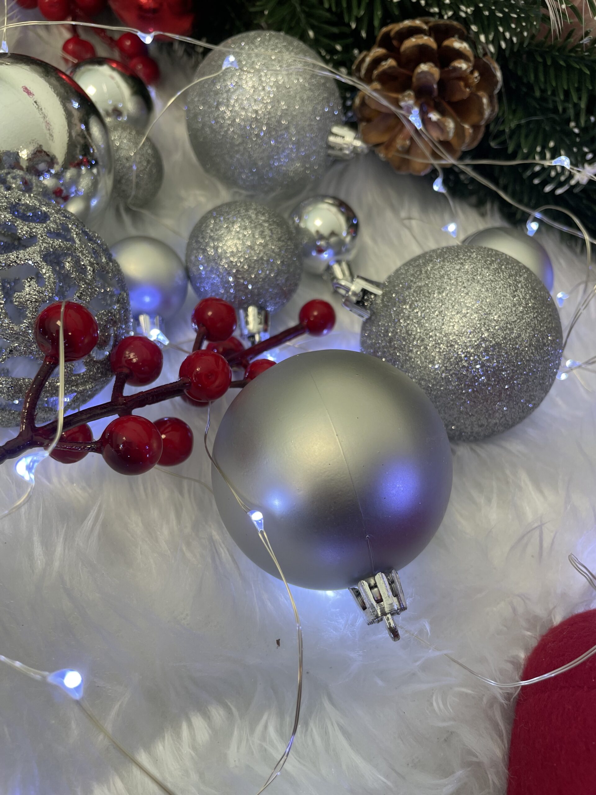 Globurile si decoratiunile dintr-un set cu o singura culoare va vor permite sa creati un decor minunat pentru brad. Arata frumos in timpul zilei si dupa intuneric, insotite de iluminat festiv. Setul include snururi care va permit sa agatati globurile rapid si usor in locul dorit. Diversele dimensiuni va permit sa creati modele inedite de aranjare a bradului de Craciun. Culoare: argintiu Material: plastic Cantitate: 100 piese Modele: modele diferite incluse in set Diametru: diverse marimi Designul din plastic creste siguranta datorita materialului incasabil. Alegerea lor in locul globurilor de sticla va contribui la siguranta celor mici din casa. Setul include urmatoarele piese 1 buc stea pe varf de aproximativ 20 cm 8 bucati de balouri ajurate de 6 cm 8 bucati de balouri stralucitoare de 6 cm 8 bucati cu sclipici de 6 cm 8 bucati de balouri mate de 6 cm 12 bucati de bulgari stralucitoare de 4 cm 12 bucati de sclipici de 4 cm 12 bucati de bulgari mate de 4 cm 8 bucati de bulele stralucitoare de 3 cm 16 bucati de sclipici de 3 cm 8 bucati de bulele mate de 3 cm Atentie! Numarul de piese din set poate varia + - 1 buc.