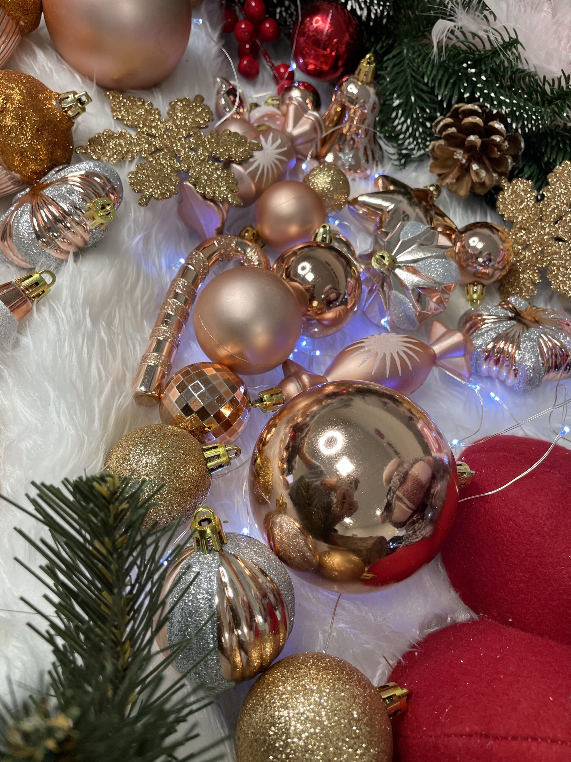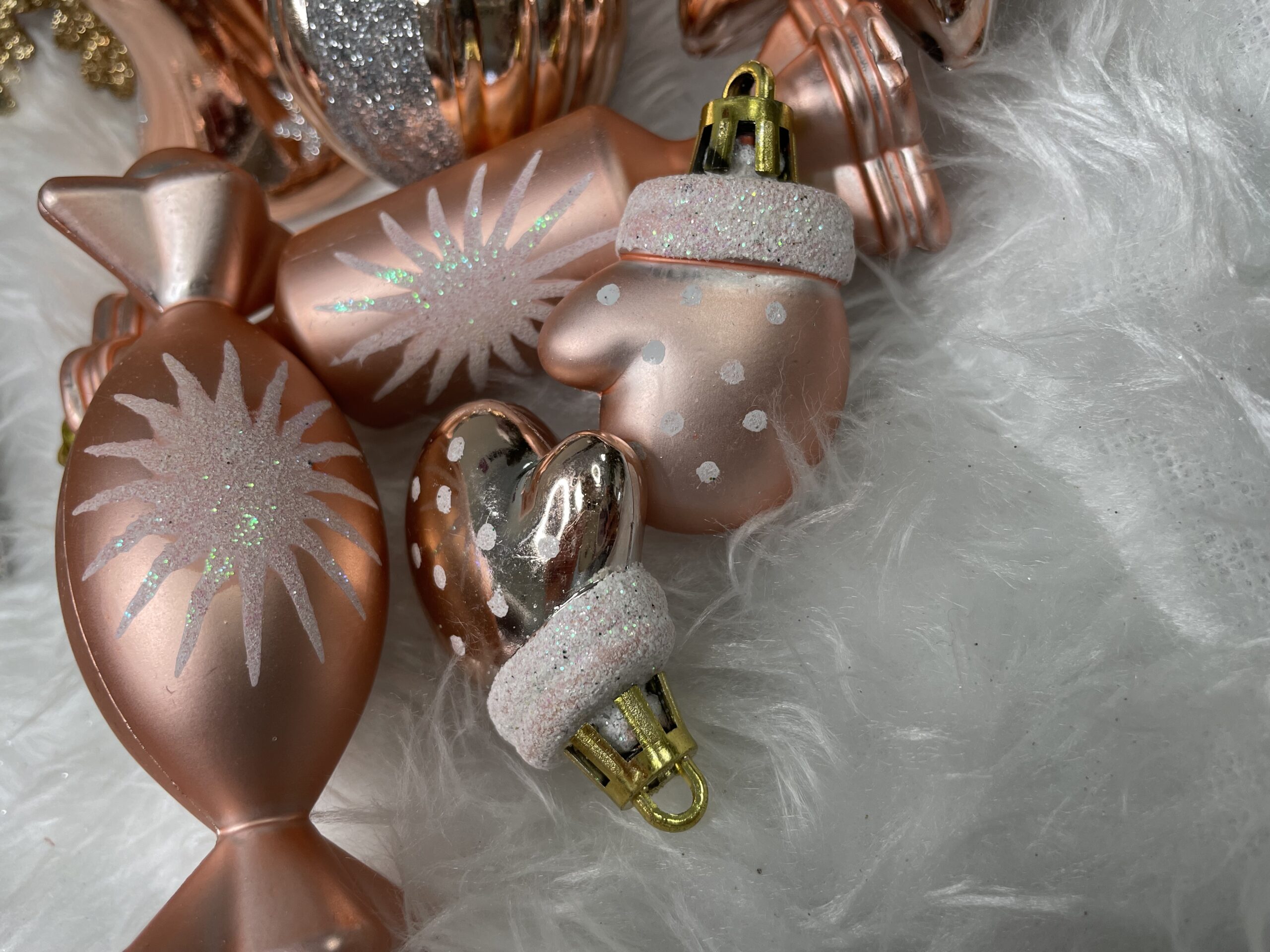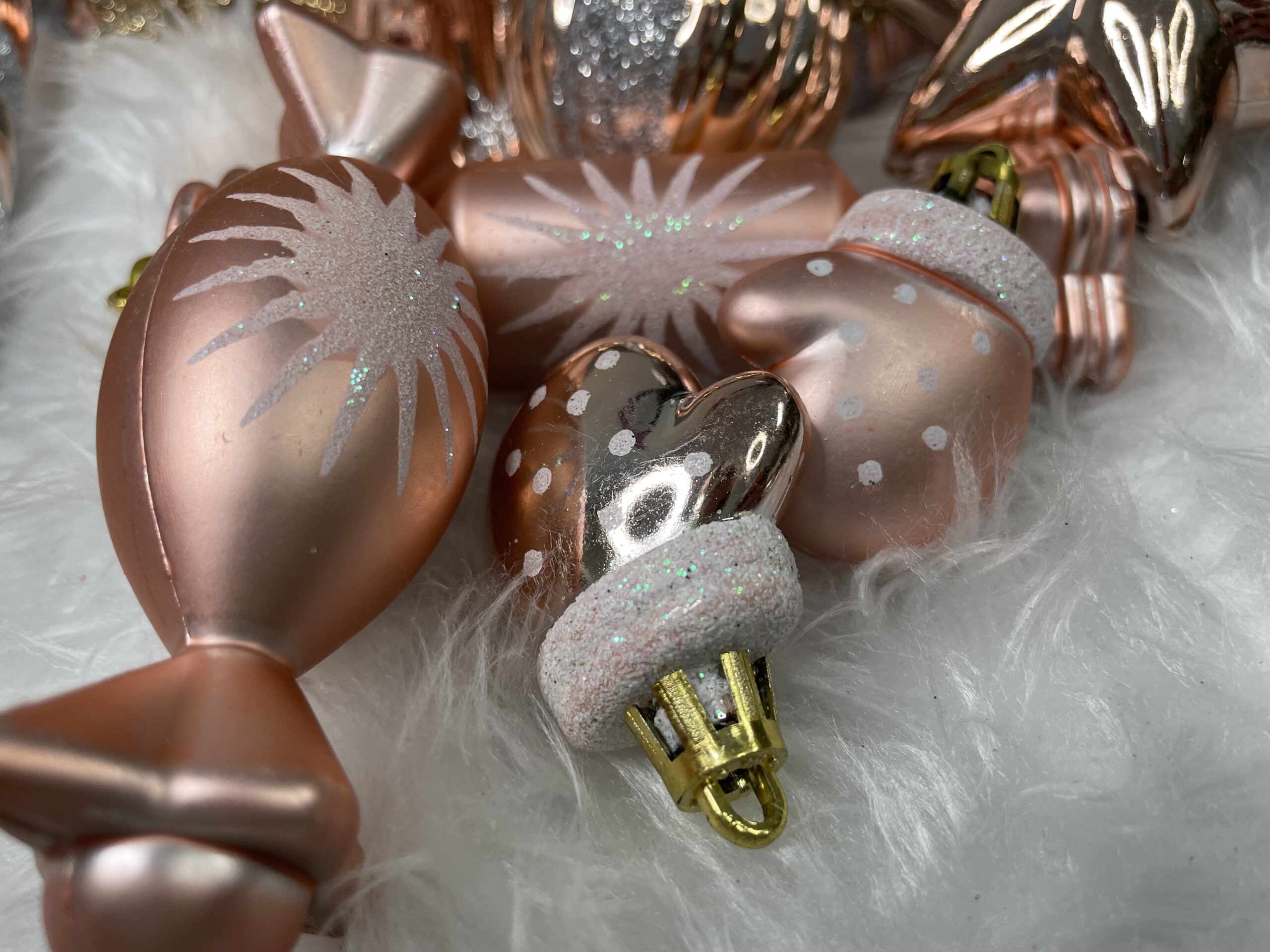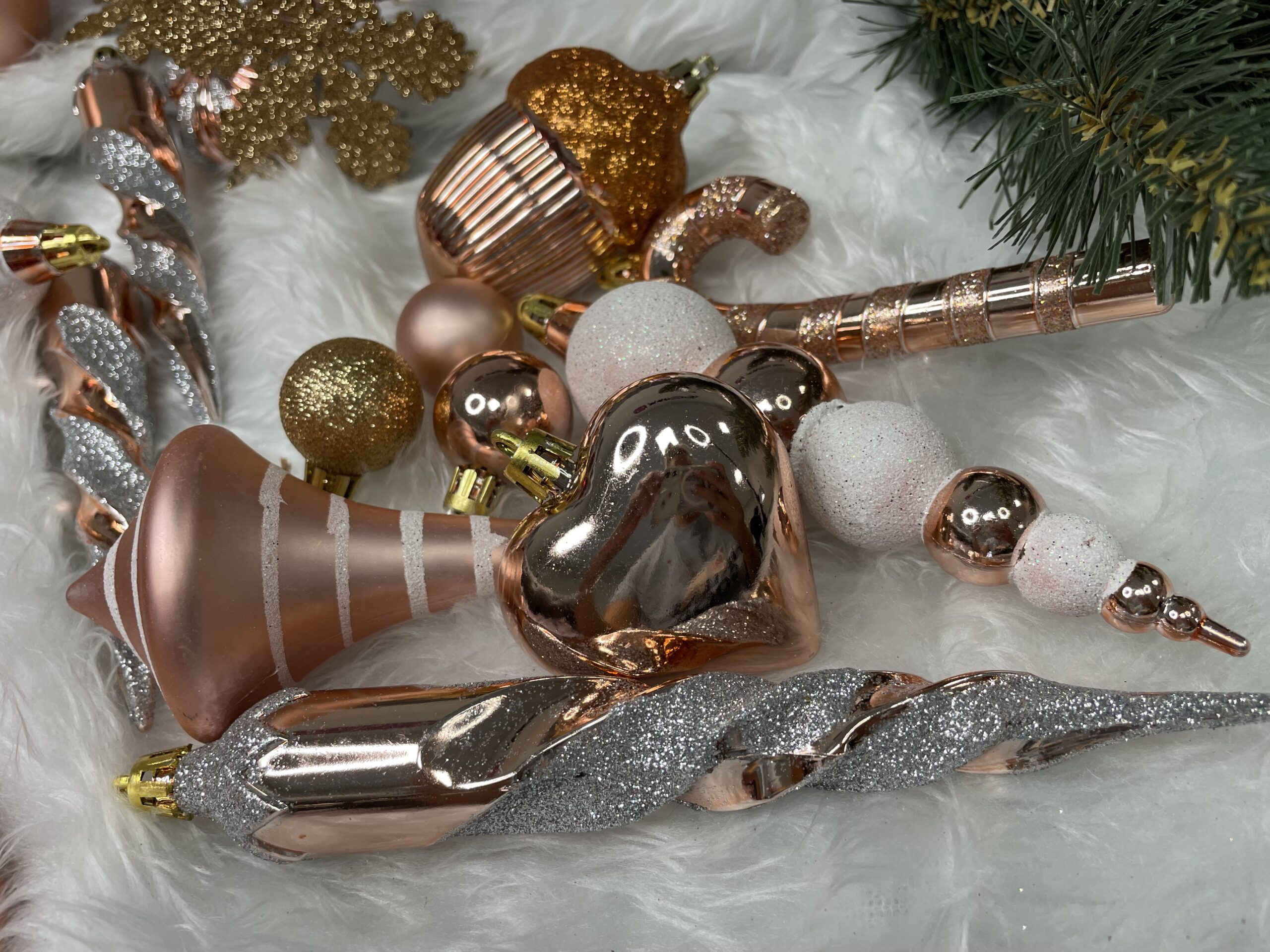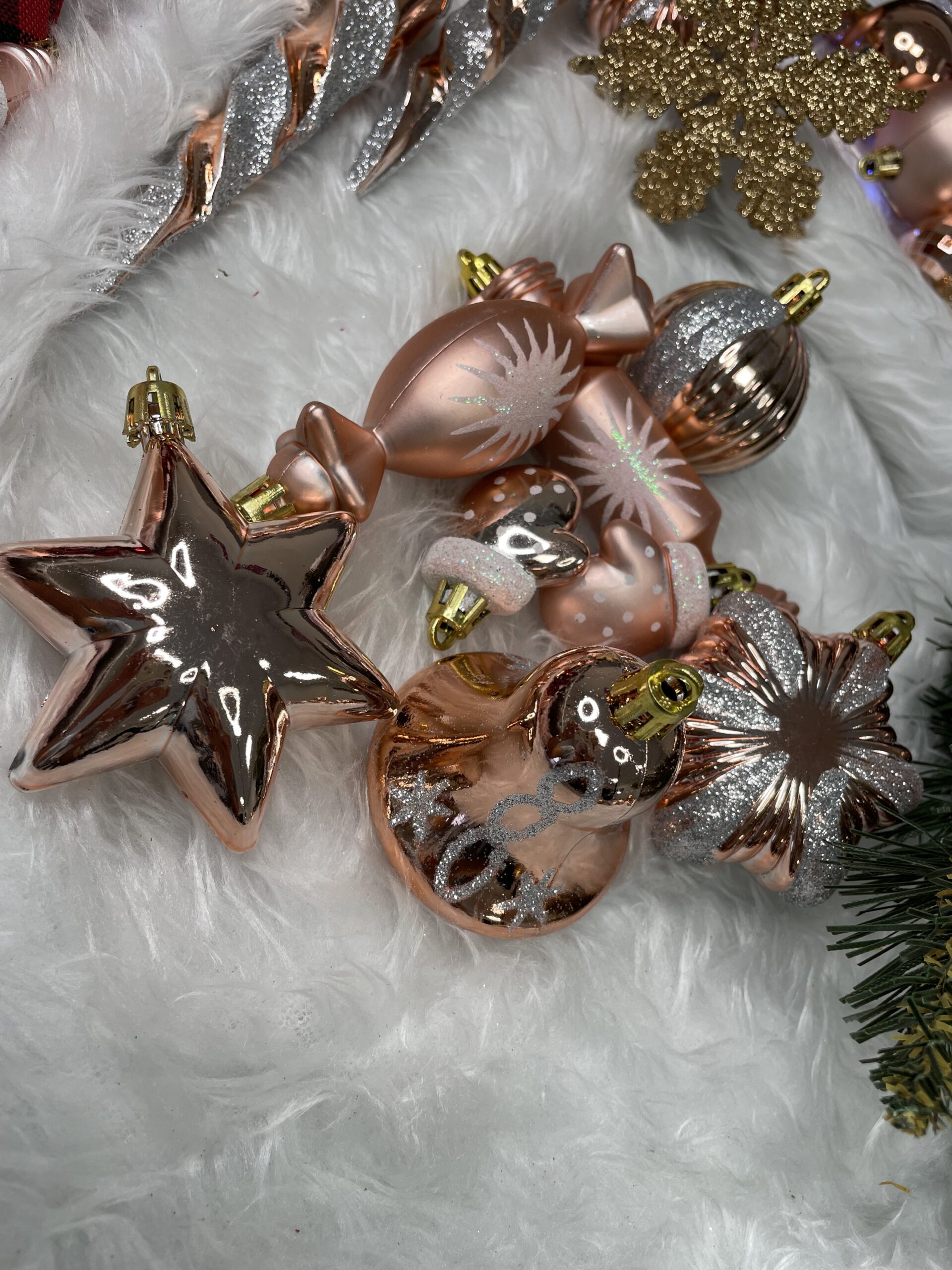 Set globuri si decoratiuni de Craciun, 152 piese, diverse dimensiuni, roz auriu